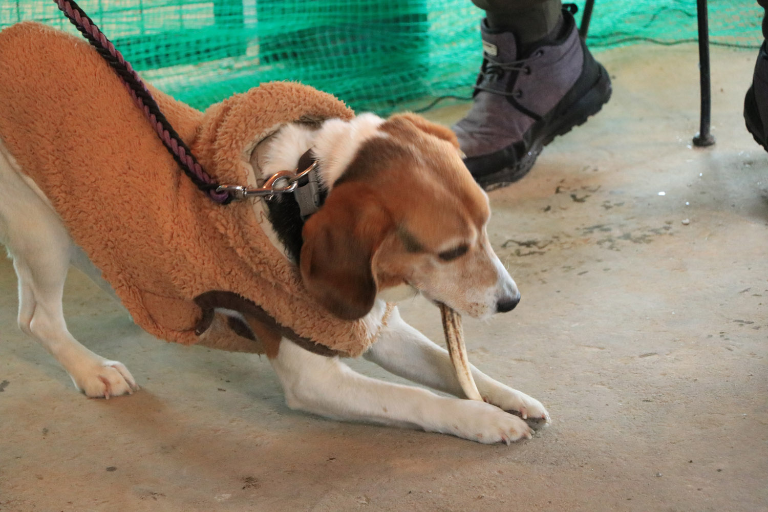 愛犬のために慣れない手つきで鹿の角でおもちゃづくり