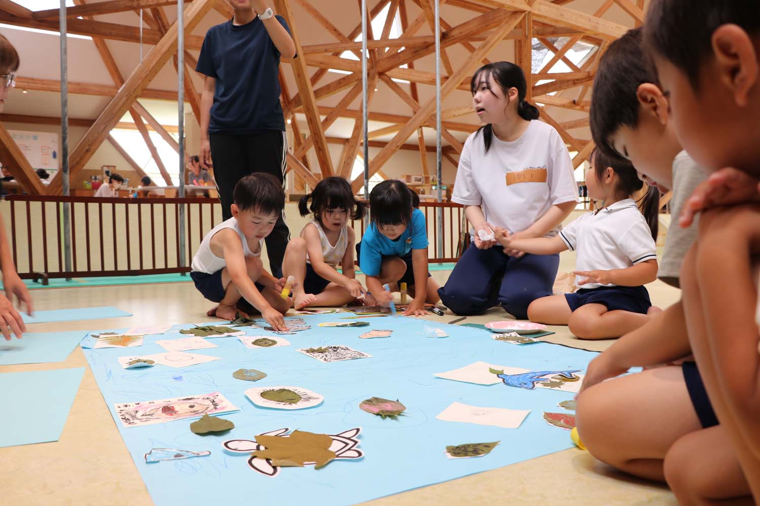 このイベントは葉っぱや画用紙などを使って、魚を作り、海を模した画用紙に貼り付け、自分たちだけの水族館を作るものです。