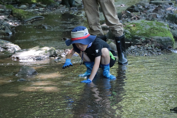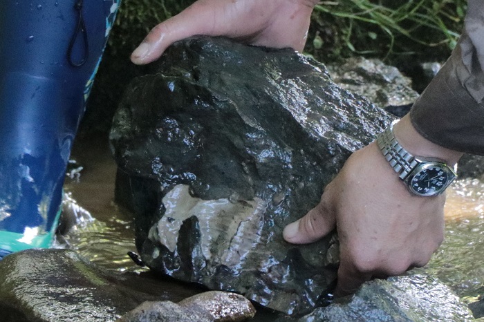 乳吞川では1億年前の地層が見える場所もあり、過去にもアンモナイトや二枚貝などの化石が発掘されており、子どもたちは指導のもと化石探索に夢中でした。