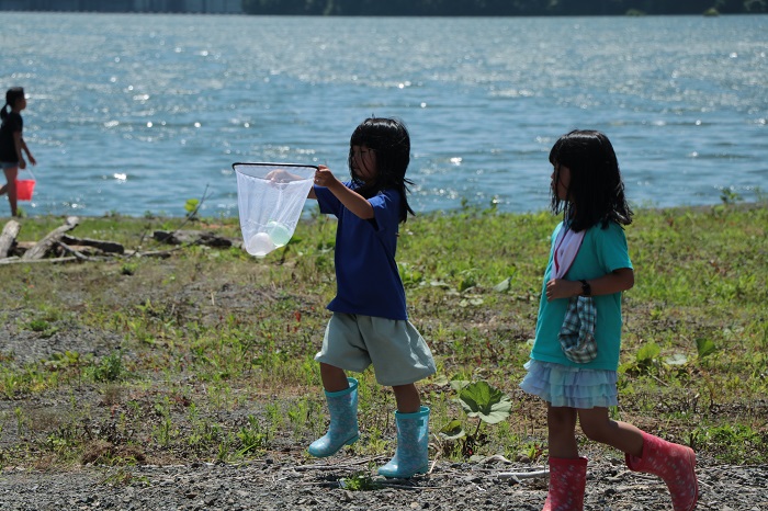 イベントでは浦河ダムの周辺と普段は入れないダムの中を見学。その後うらら湖畔へ移動し、魚釣り大会やレクリエーションが行われ、魚釣りでは子どもたちがカニやウグイを釣り上げにっこりと笑顔を見せていました。
