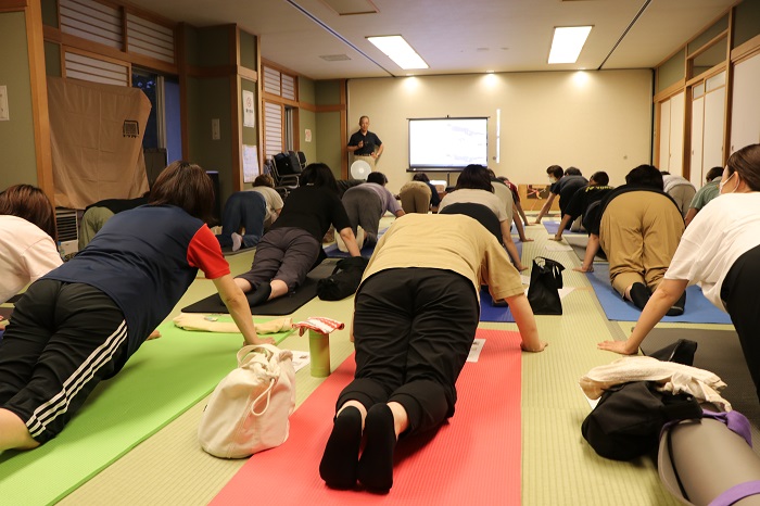 研修は参加者が業務による腰痛や肩こりなどの身体的負担に対して対する対処法や健康管理について学ぶことを目的として開催され、はりきゅうひさの整骨院の久野達郎院長を講師に、実際にストレッチや筋力トレーニングを交えながら行われました。