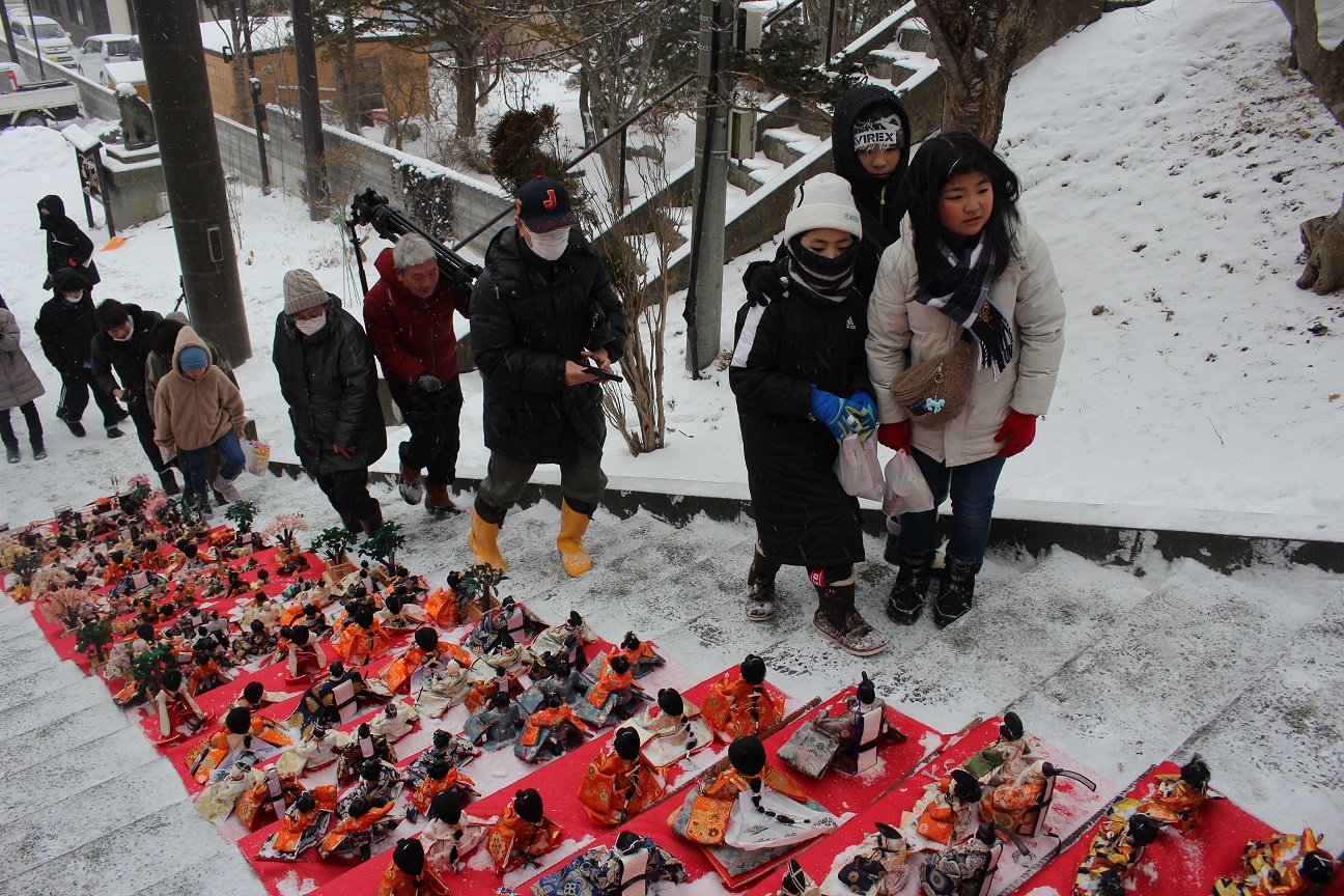 当日は雪や強風のため当初の1/3の規模としながらも、本殿に続く石段に町内から寄付された220体のひな人形が並べられ、赤い布を鉄の棒でおさえ人形は目立たないようにテープで固定するなどの対策を施し、開催が実現しました。