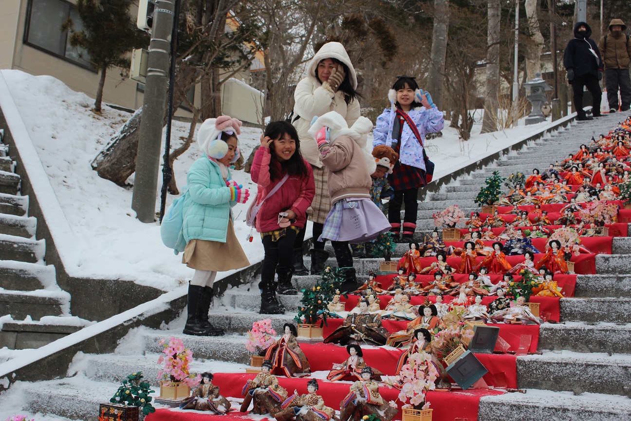 浦河神社の石段にひな人形を飾るイベント「第2回うらかわひなまつり」が3月2日に開かれ、町内外から多くの親子連れや写真愛好家らが訪れました。