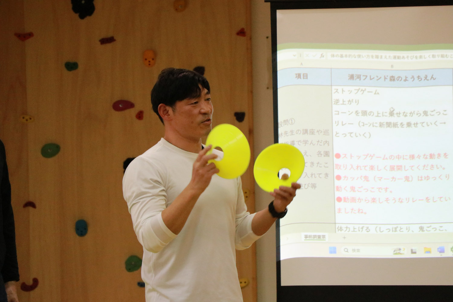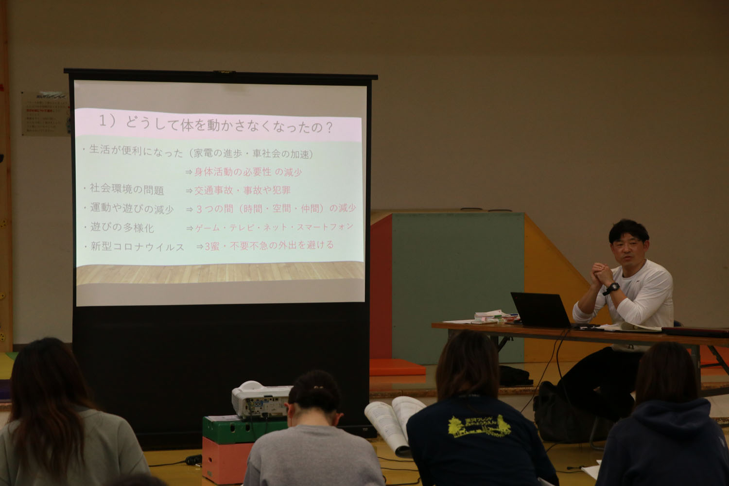 講座では過去の体力テストなどのデータを見ながら、実際に体を動かしつつ効果的な運動遊びの内容を考えました。