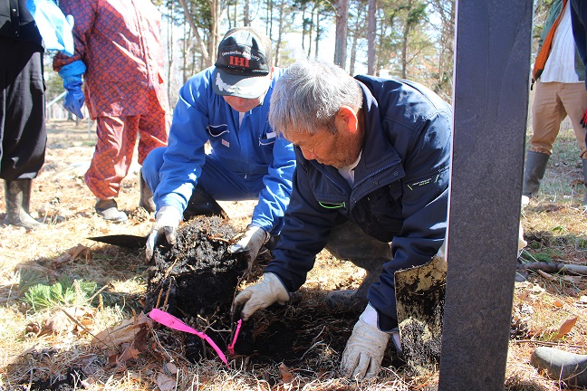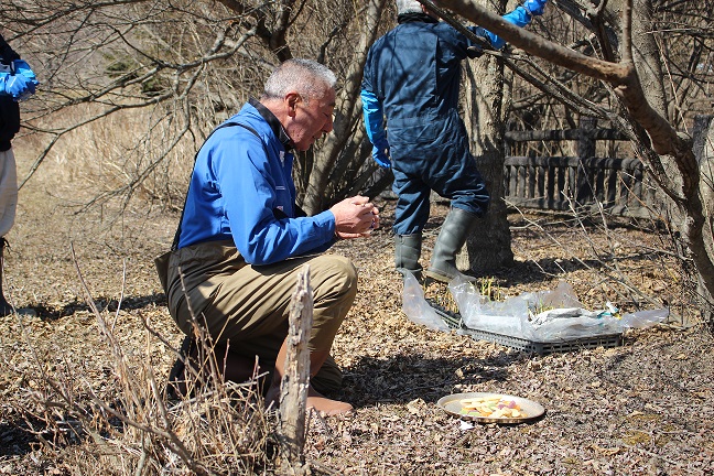 植樹に先立ち、大地や沼の神に苗を植えることを伝えるため、カムイノミで祈りを捧げてから、土を掘り起こし苗を植えました。