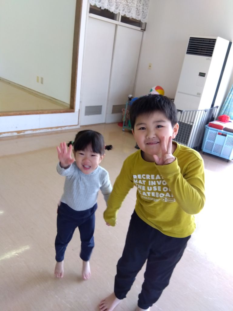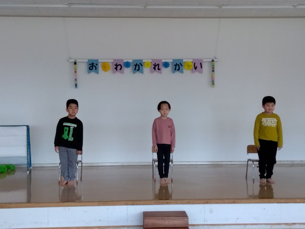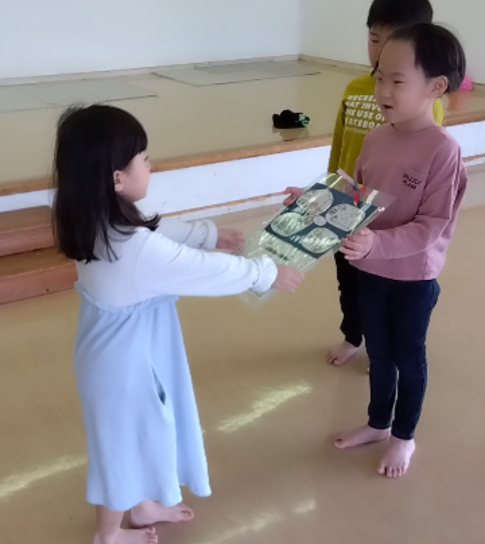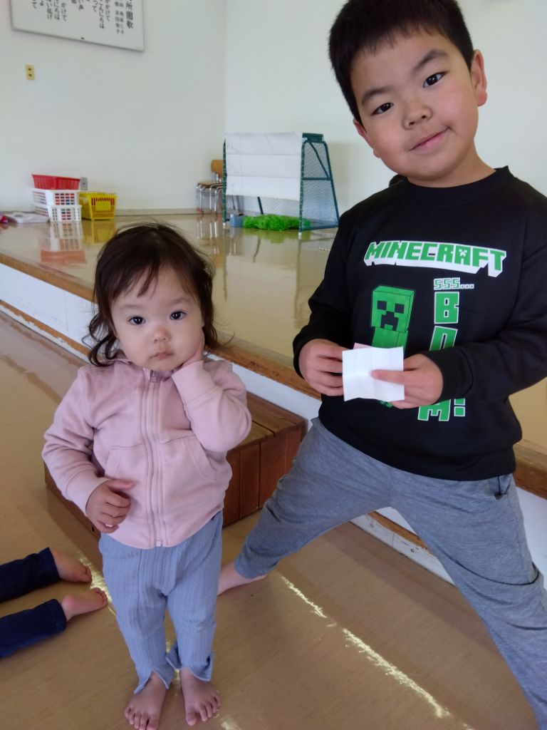 3月26日に保育所でお別れ会を行いました。 思い出作りとして、年長児と一緒にゲームを楽しんだほか、プレゼント交換では、年長児から在園児へアイロンビーズで 作った「肉球」を、在園児から年長児へは「手作りカレンダー」をもらい、子どもたちは大喜びでした。 年長児との楽しい時間に笑顔あふれるひとときとなりました。
