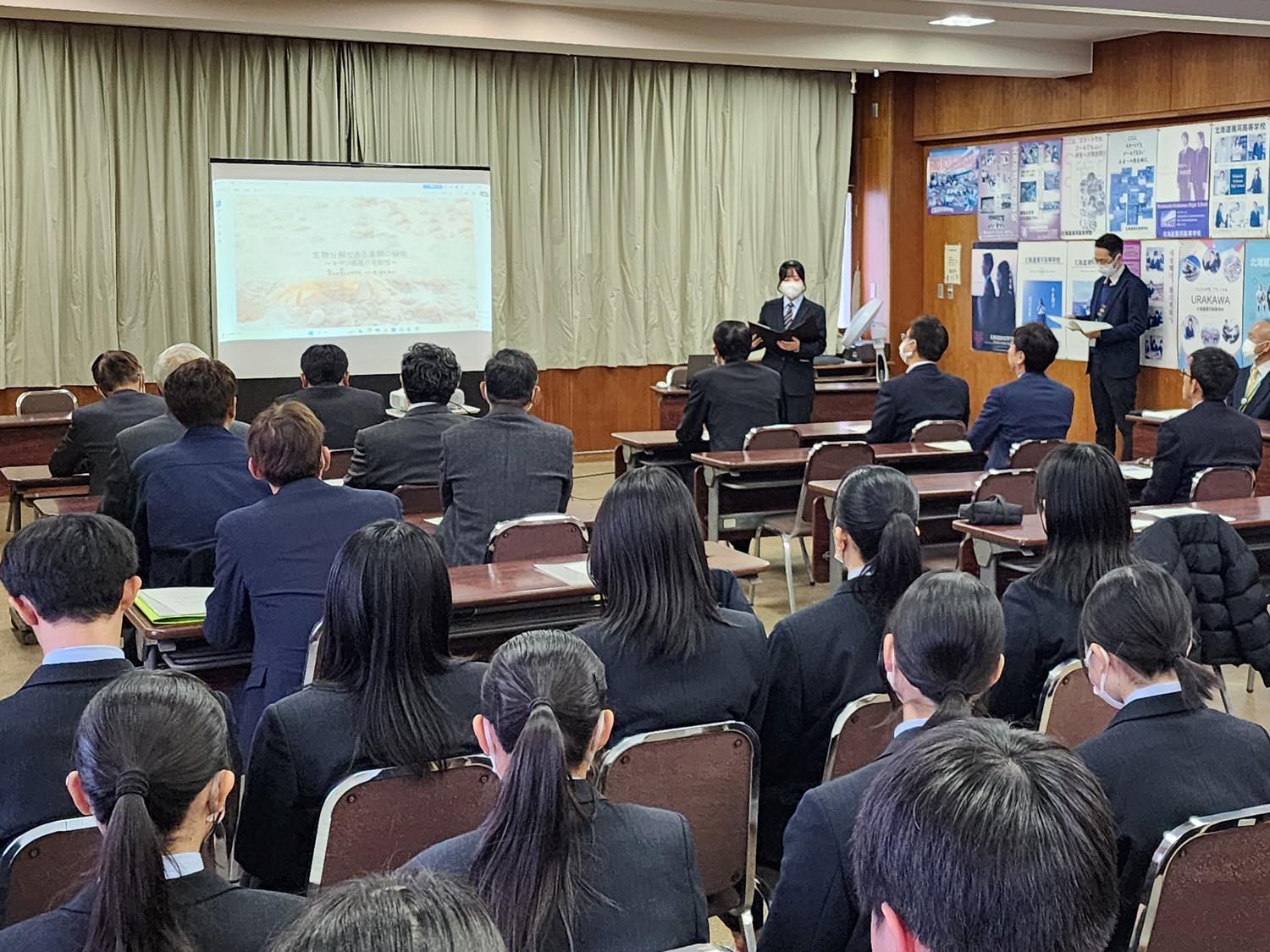 生徒らは、総合探究の授業を通じて設定したテーマをもとに研究を進め、その成果を発表。今回は2~3年生の中から選ばれた5つのグループが発表を行い、絵本を活用した外国人との共生に関する研究や、カニの殻を使った自然分解可能な漁網の開発についての研究など、多彩な提言が披露されました。