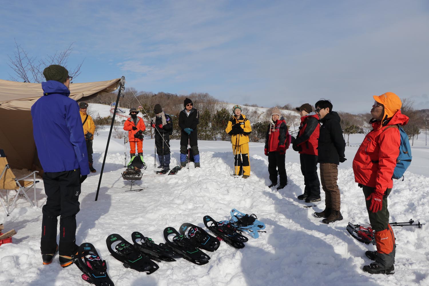 このイベントは、AERU敷地内にある約2.6kmのフットパスコースをスノーシューを履き歩くもので、参加者は雪景色の中を進みながら、山の風景や動物・鳥の営みを観察し、冬ならではの自然を楽しみました。