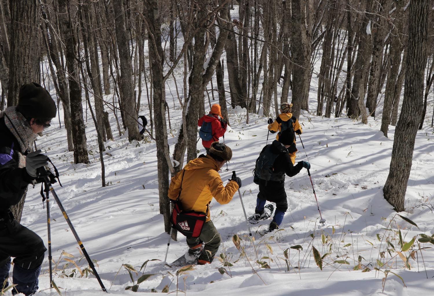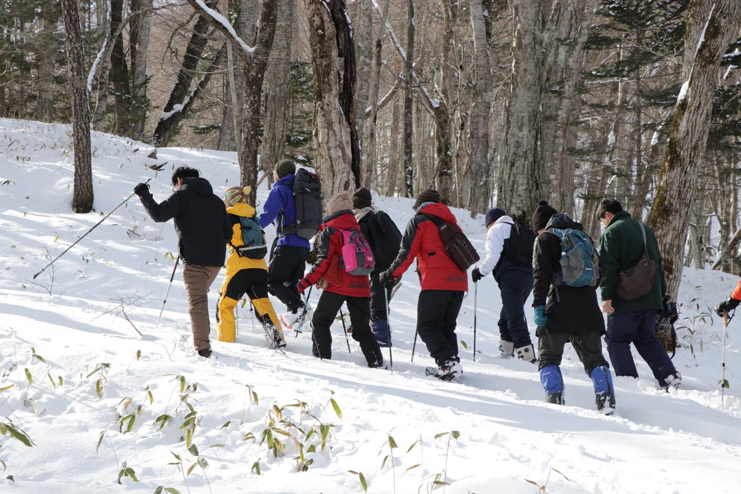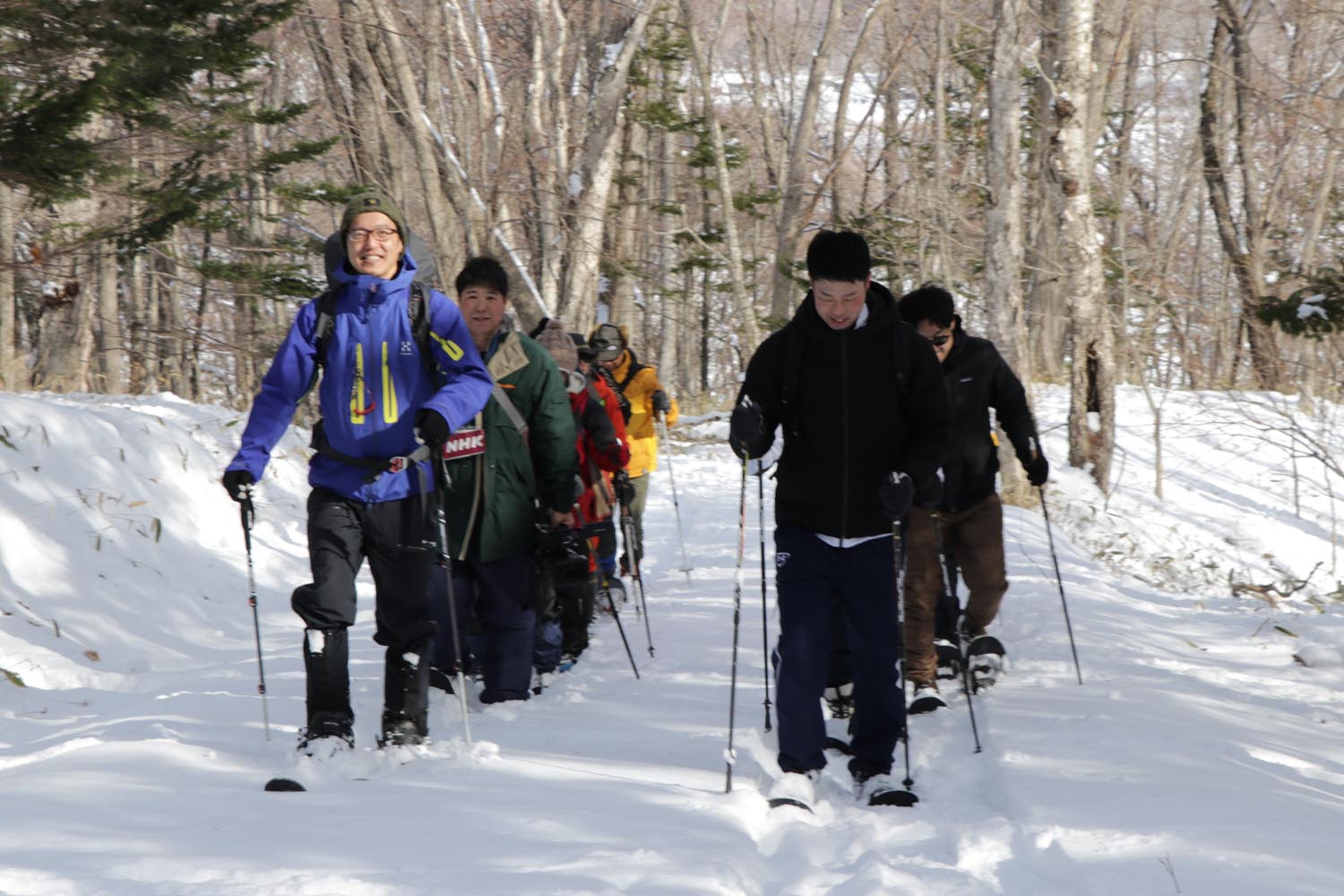 地域おこし協力隊の白取隊員が主催する「スノーシューウォーク」が、2月9日、浦河優駿ビレッジAERUで開催され、12人の参加者が冬の山を散策しました。