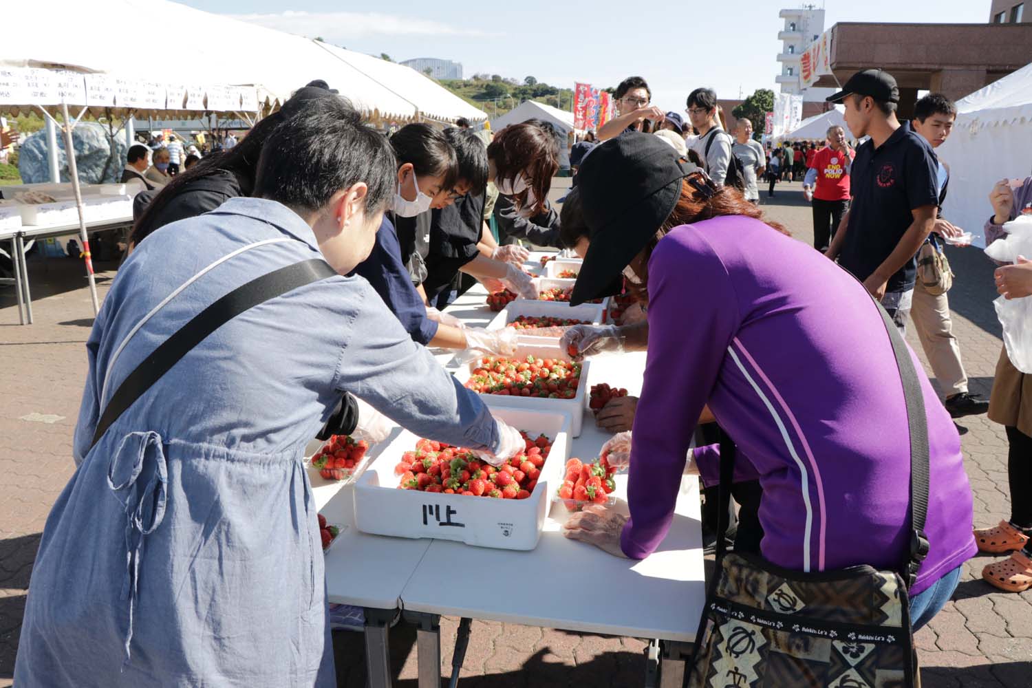 産業まつりでは、秋の味覚である玉ねぎ、にんじん、じゃがいもの詰め放題や夏いちごの詰め放題ほか、5年ぶりに秋サケのつかみ取りが開かれ、参加者らは逃げるサケを捕まえようと必死になって追いかけました。