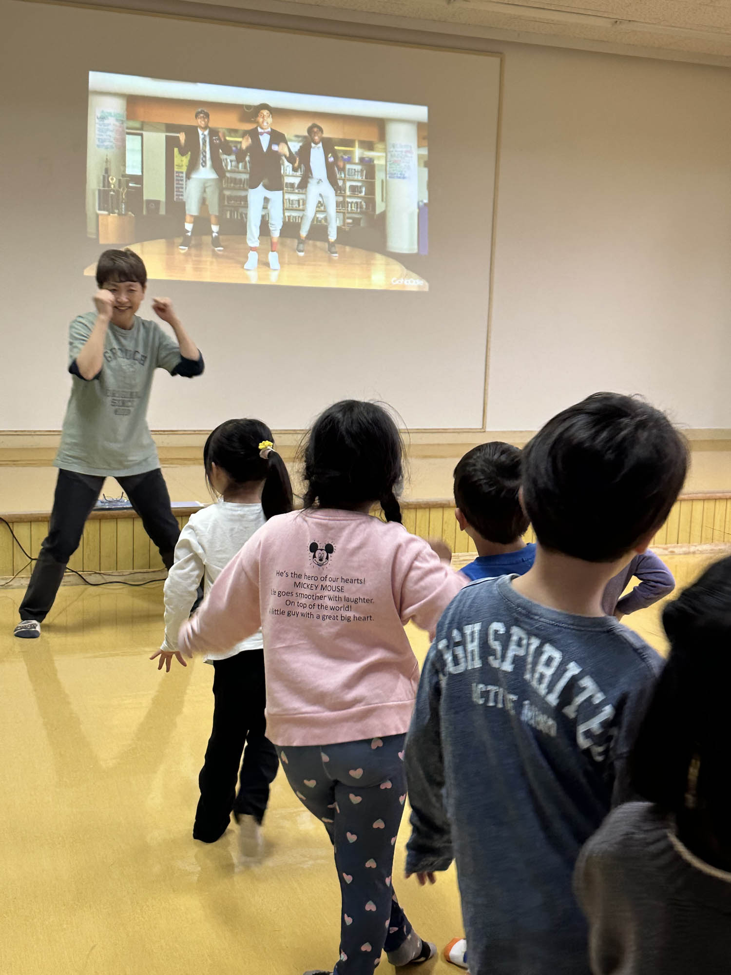 こんにちは、荻伏保育所です。 4月19日に地域おこし協力隊の髙畠さんによる「英語を使ったあそび」が行われました。 朝、高畠さんに会うと「ハロー」と英語で挨拶する子もいましたよ。月1回ではありますが、半年以上続けてきた成果なのでしょうか?今日も楽しそうに参加していた子どもたちです。