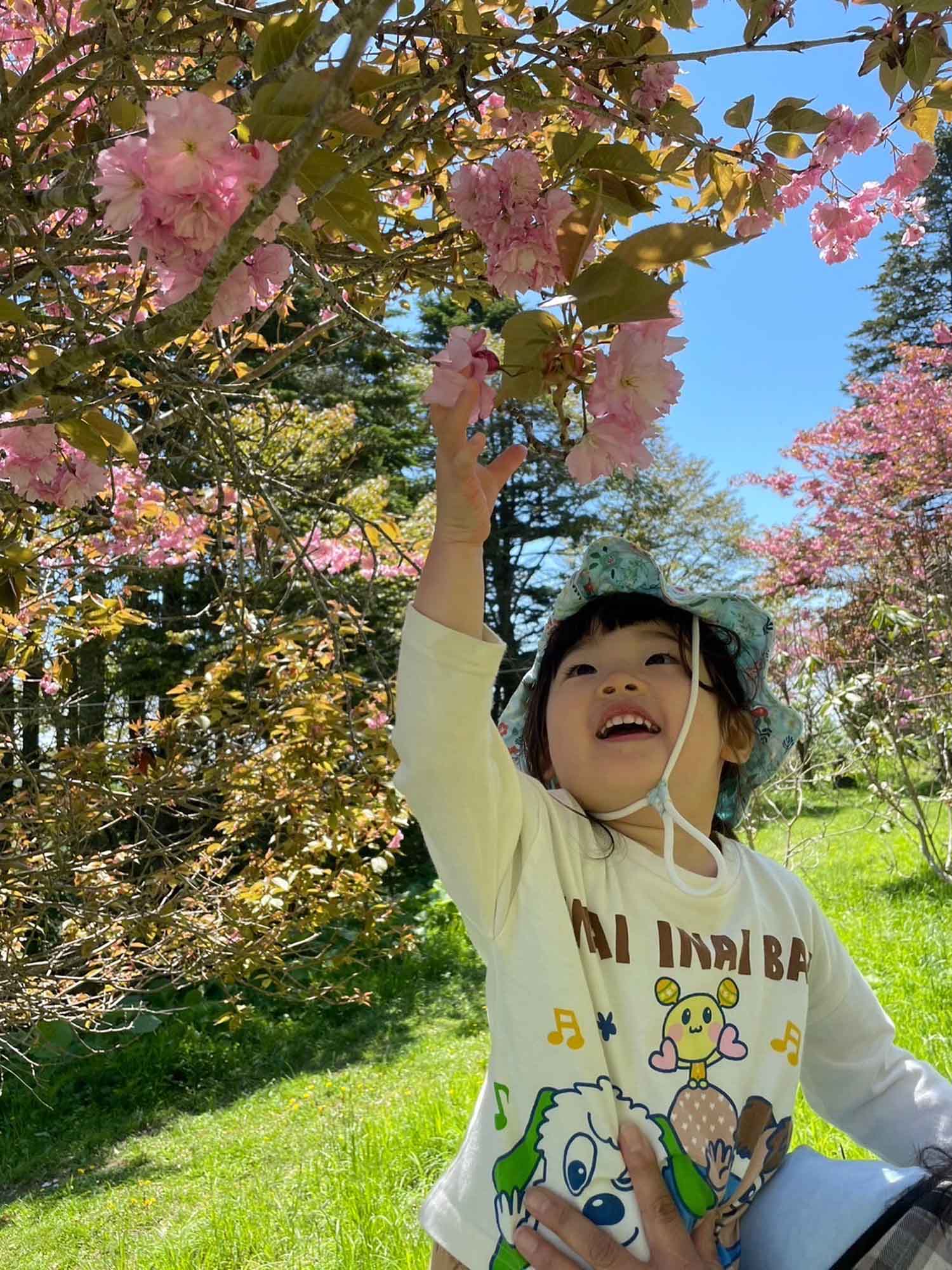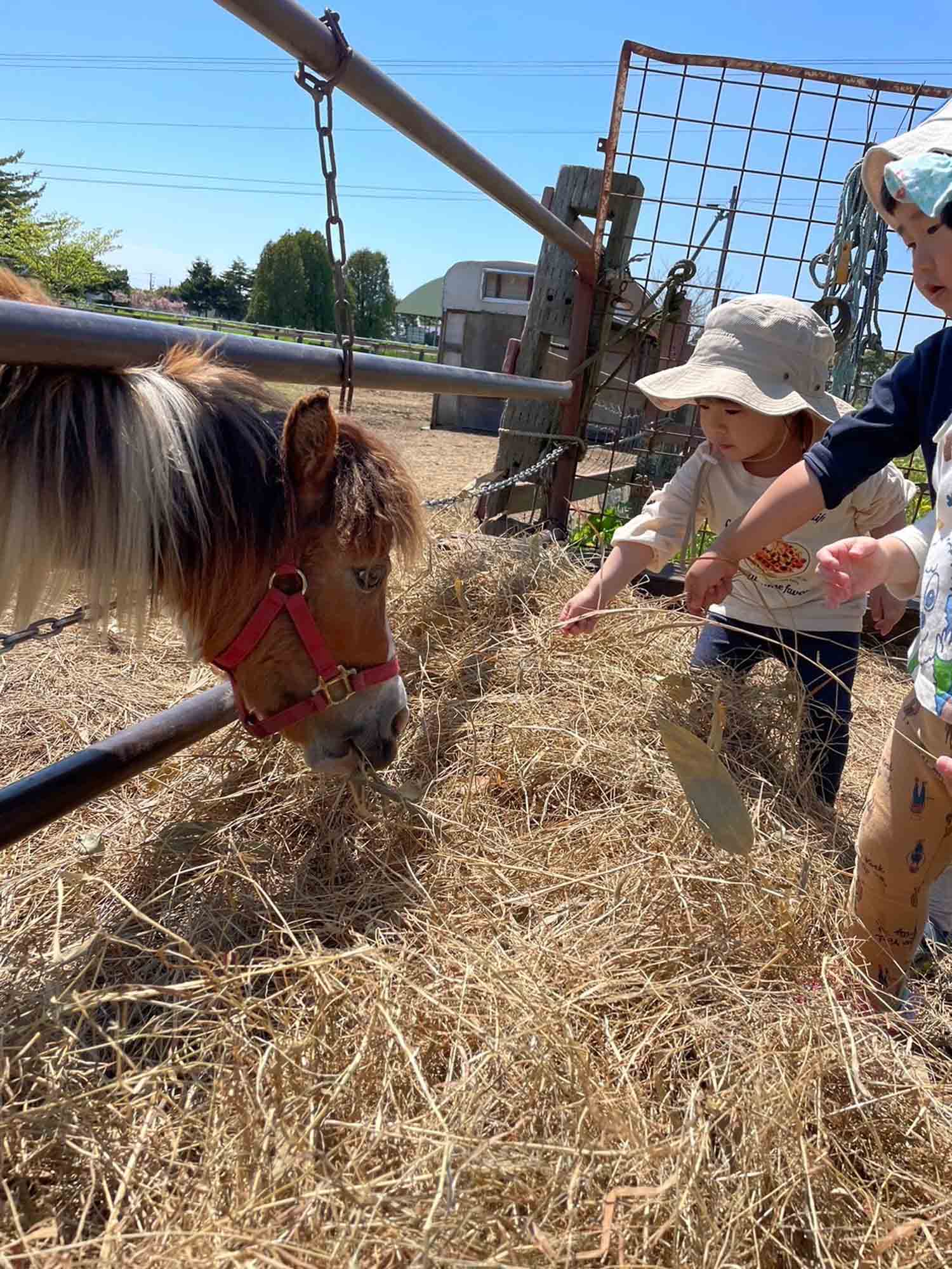 0~2歳児クラスは、荻伏神社方面へ行ってきました。神社へ向かう途中にある牧場で、ポニーや、やぎに草をあげたり、遅咲きの桜を見てきました。天気も良くとってもきれいに咲いていました。