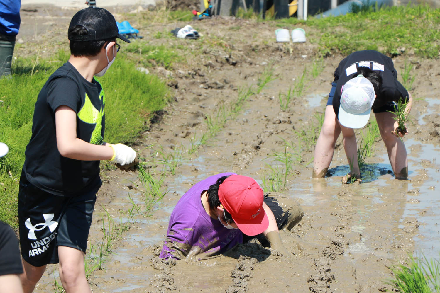 田植え体験後、荻伏小の横山悠斗さんは「田んぼの感触が最初は気持ち悪かったけれど、慣れたら楽しかった。苗を植えるのがジグザグになってうまくできなかったけれど、大人の方のお手本を見て、最後はうまく植えることができました。お米になったら塩むすびにして食べたいです」と満足気な様子で話していました。