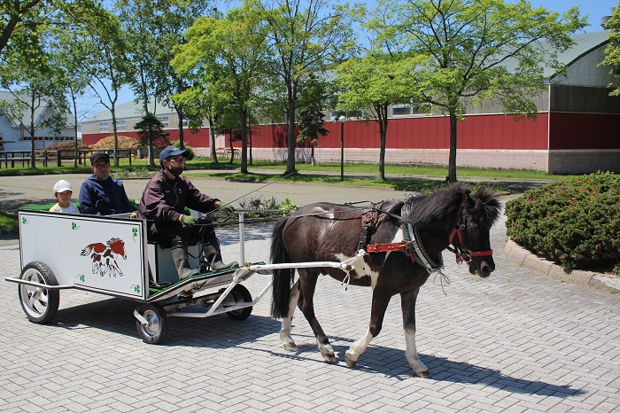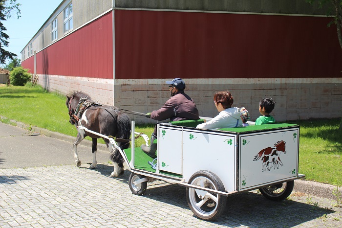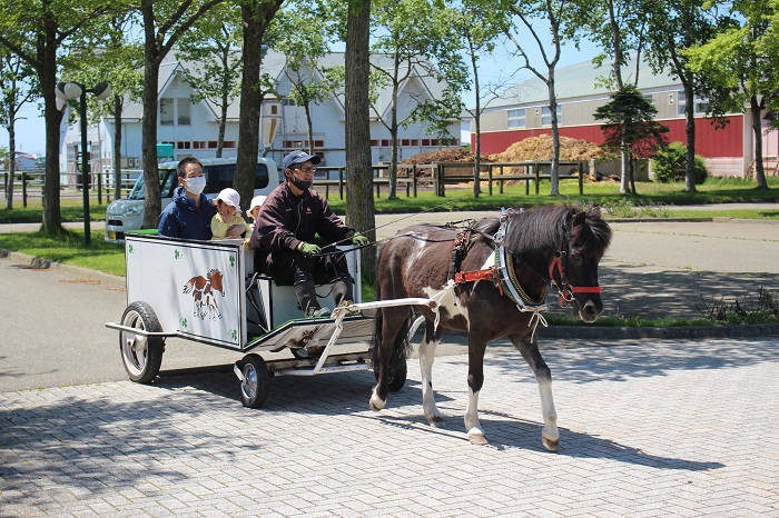 5月25日、JRA日高育成牧場からポニー馬車が寄贈されたことを記念して、乗馬公園で「ポニー馬車試乗会」が開かれ、親子連れなど約10組が春の心地よい風の中、馬車に揺られました。 寄贈された馬車を実際に使うのは今回が初めてで、乗馬公園の頼りになるベテランポニー「サンジ」が力強く、緩やかに馬車を引きました。親子で参加した木村心咲さん(5歳)は「(馬車に乗ることができて)楽しかった」とはにかんだ笑顔で話していました。