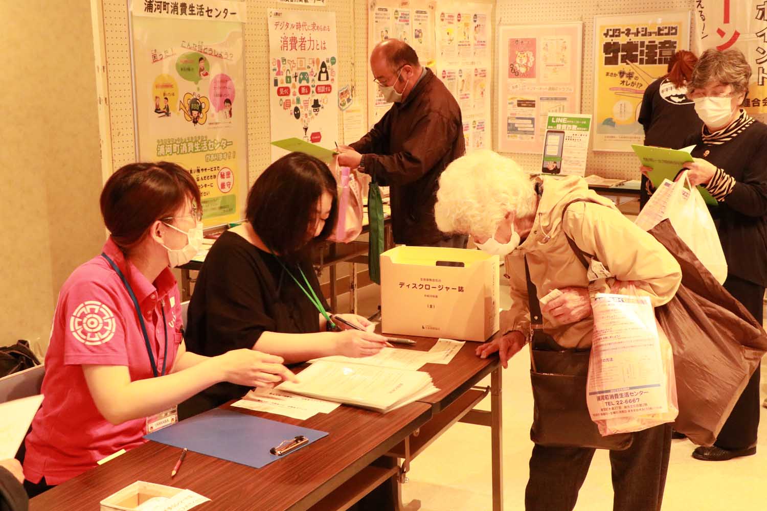 このイベントは、5月1日から31日までの消費者月間に合わせ、消費者を対象に詐欺被害などを啓発する目的で開催するもので、消費生活相談コーナーや各種啓発の展示コーナーのほか、フリーマーケット、先着100名に地域共通ポイントカード「うらかわタウンポイントUP-C(アプカ)」ポイントのプレゼントなども行われました。