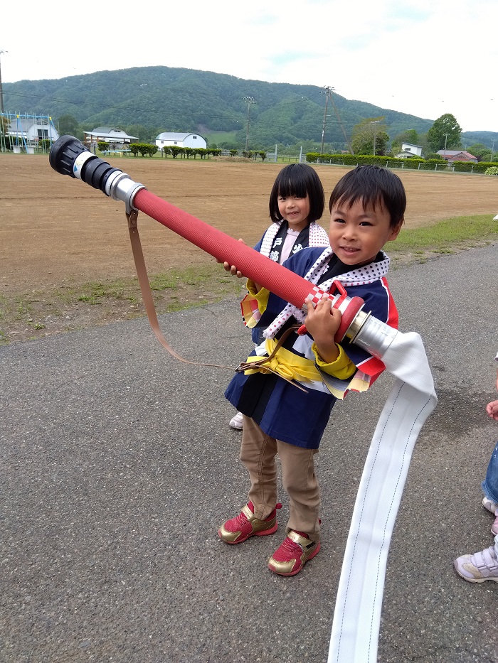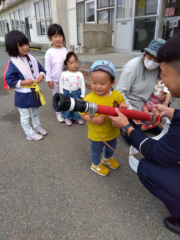幼年期から正しい火の取り扱いを学び消防の仕事を理解するため、幼年消防体験が5月31日、東部保育所にて開催されました。 子どもたちは少し緊張しながらも、年長児が入団証書を受け取り、防火の誓いを宣誓しました。 その後は消防車を見学し、ホースを手に持たせてもらったり、運転席に座らせてもらったりと、貴重な経験に笑顔があふれる子ども達でした。