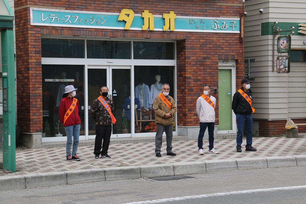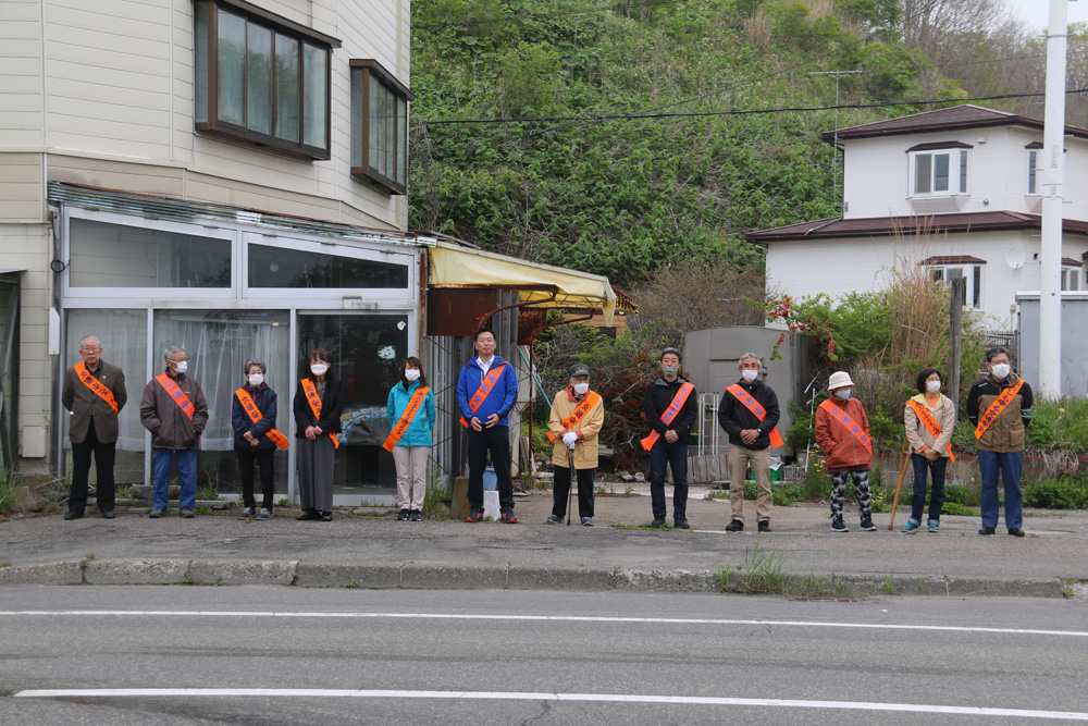 5月19日(金曜日)に、町内各地で春の交通安全週間に合わせて行う「町民交通安全の日町内一斉街頭啓発」が行われ、朝早くから地域住民らが小旗とタスキを持ち、ドライバーや歩行者へ交通安全を呼び掛けました。
