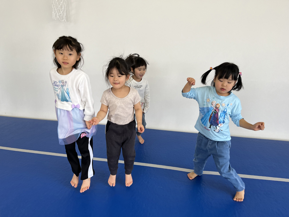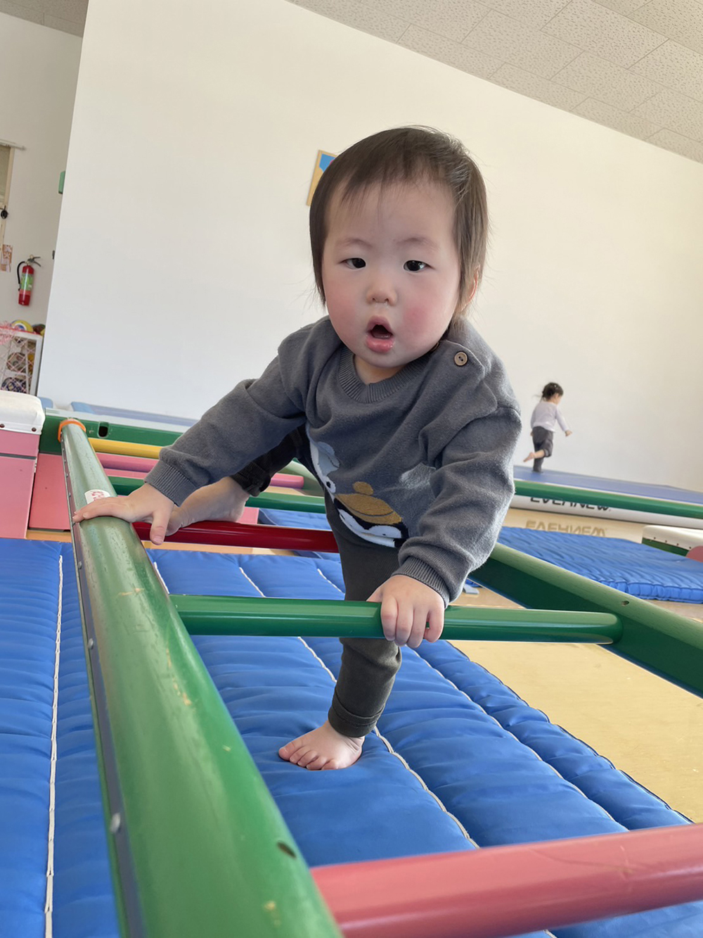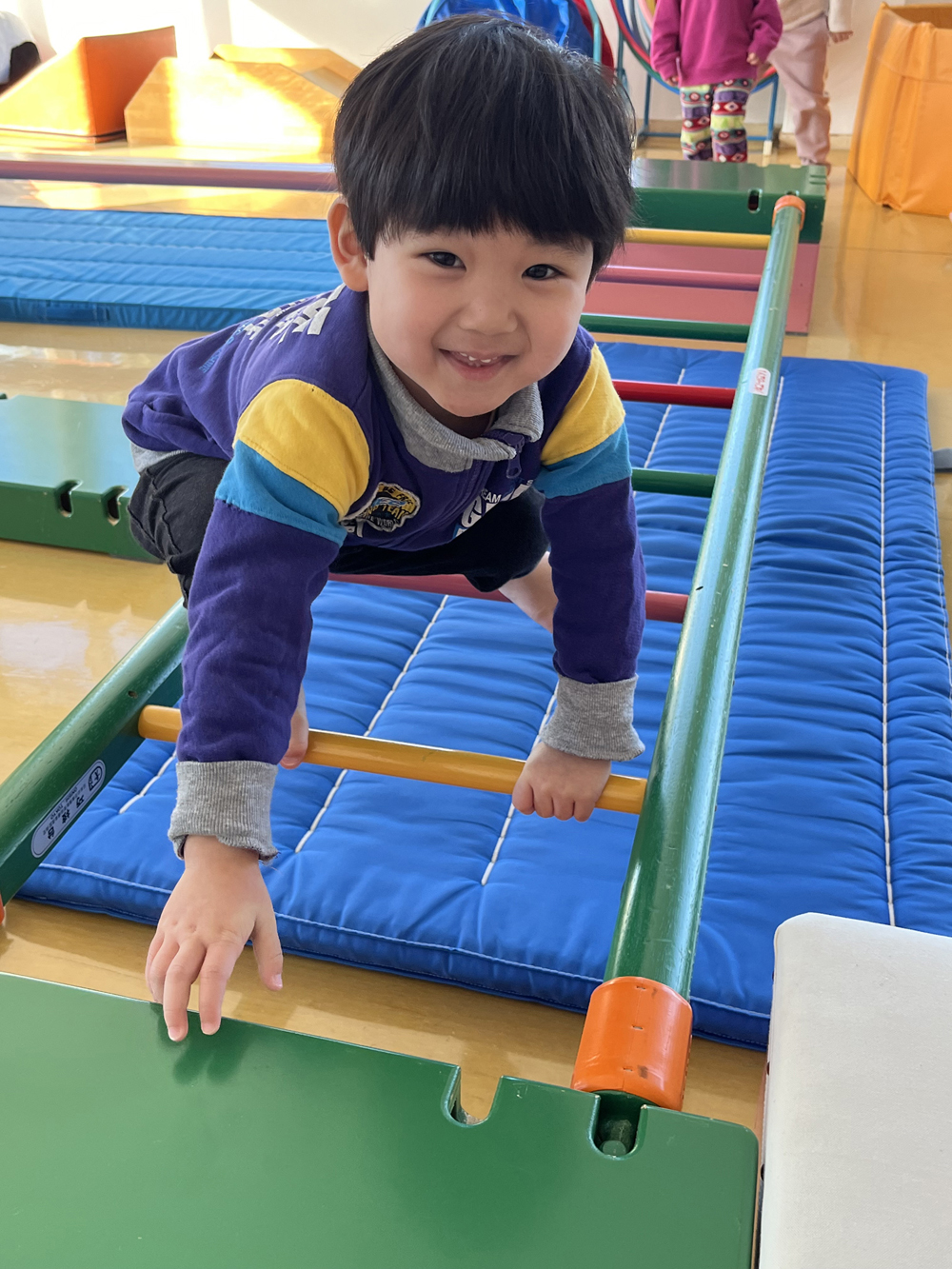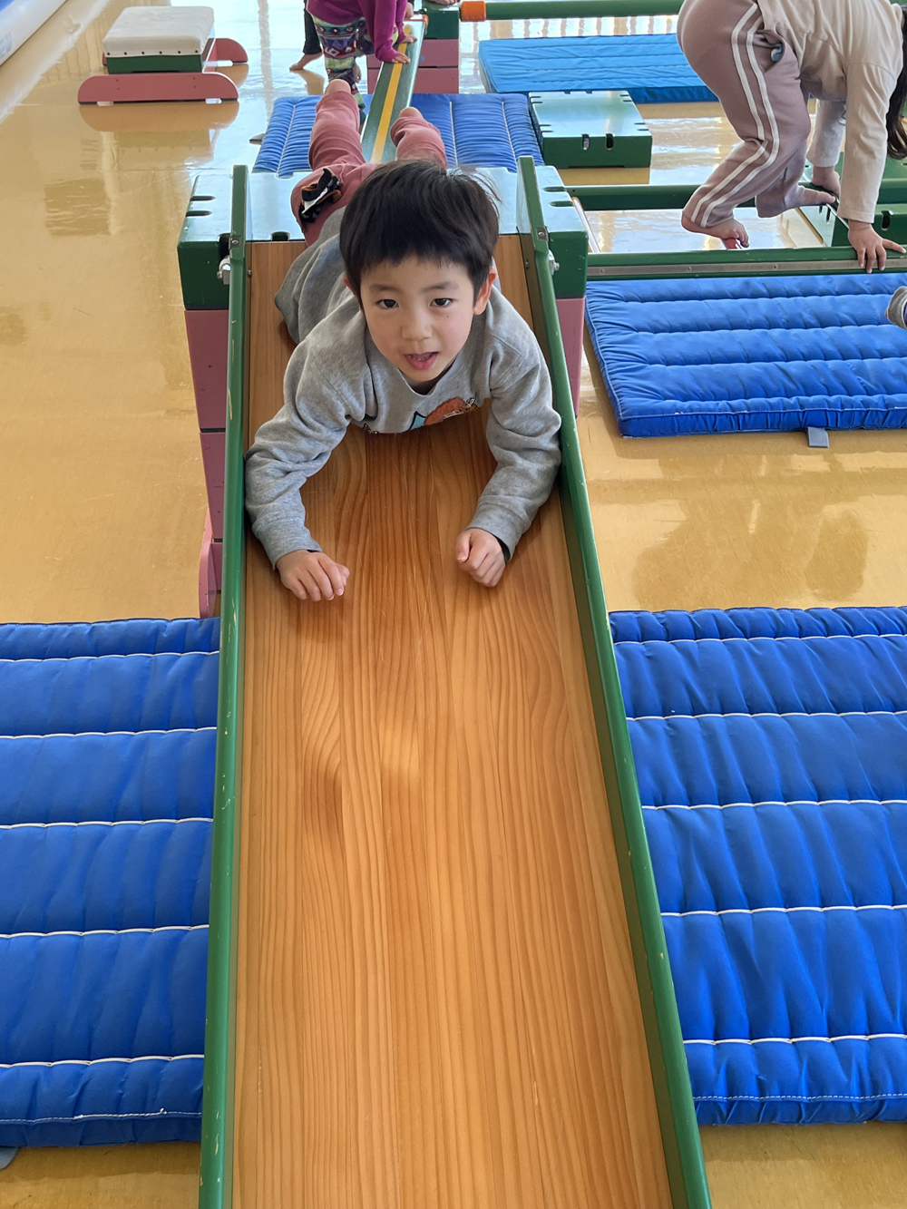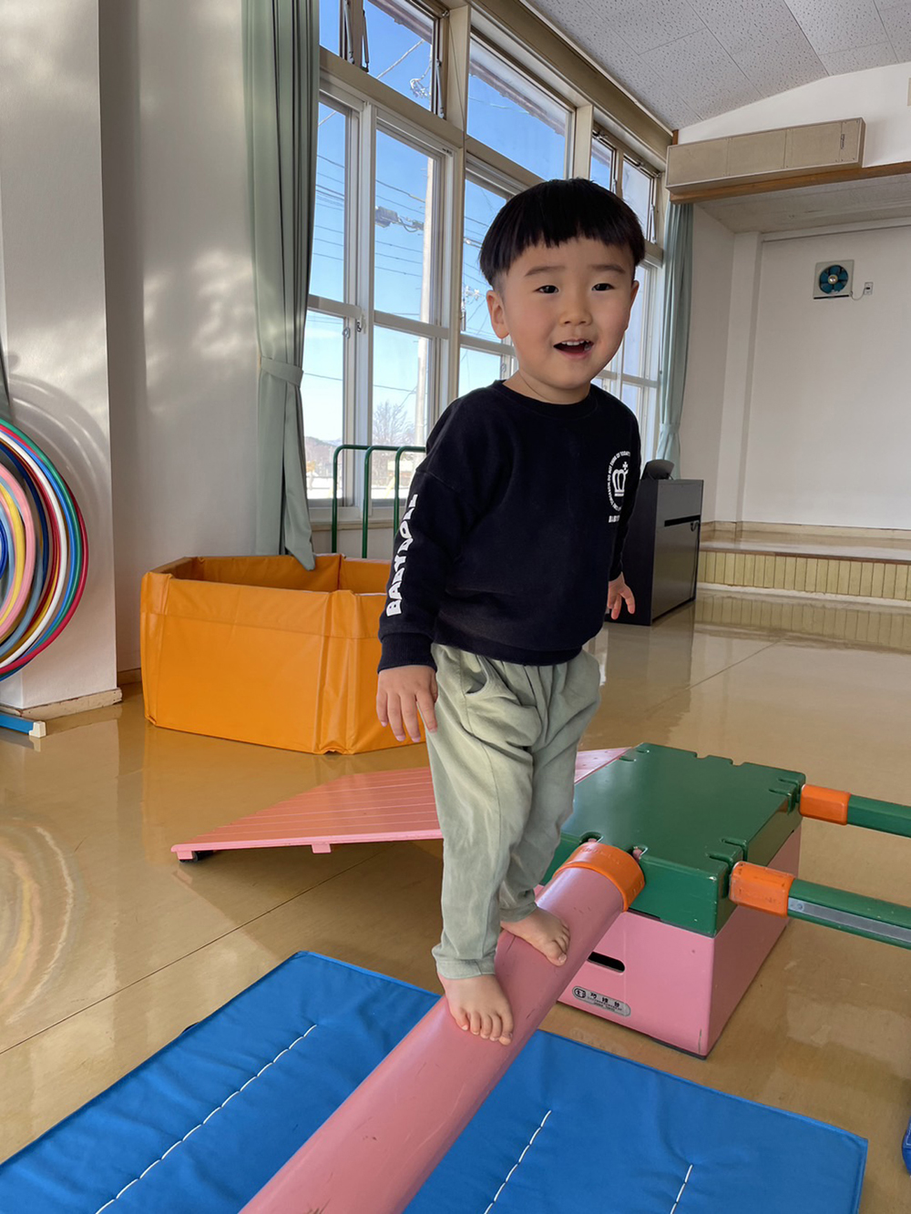 こんにちは、荻伏保育所です。 今月から1か月間、巧技台とエアトランポリンを借りてホールに設置して遊んでいます。 最初は怖がる姿が見られましたが、遊んでいくうちに楽しくなってきたようで、汗をかきながら体をたくさん動かして遊んでいます。
