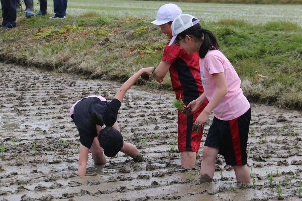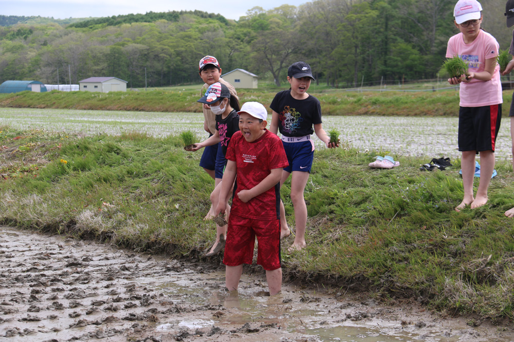 小学生らは素足になり、水田に足を入れると「冷たい」「ヌルヌルする」など、慣れない感触に驚きながらも、夢中で稲を植えていました。