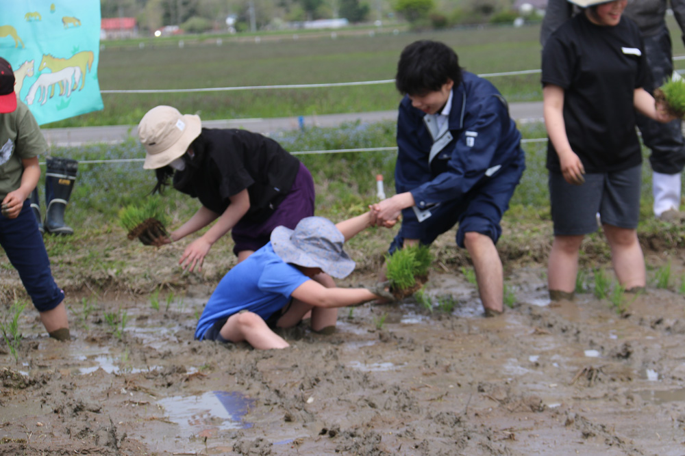 浦河町土地改良区が主催する、「小学生児童の田植え体験学習」が5月23日(火曜日)に、富里地区の福岡広行さんの宅の水田で行われ、浦河東部小学校と荻伏小学校の5年生17人が参加しました。