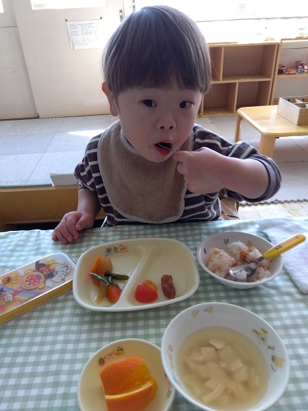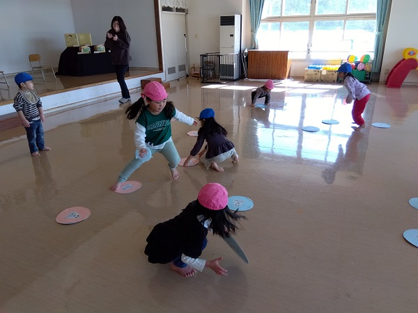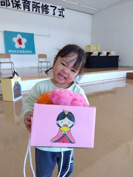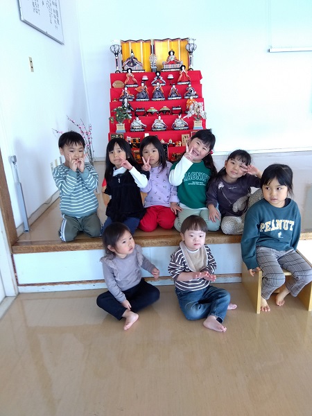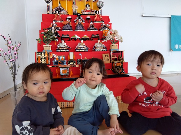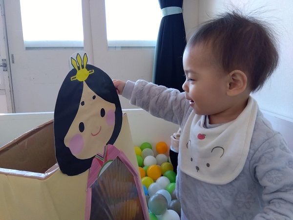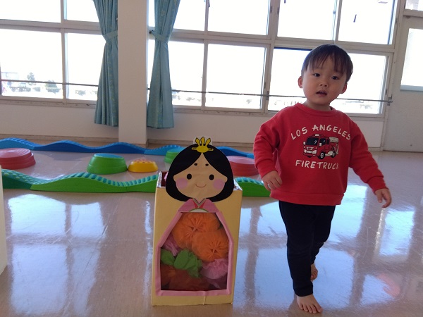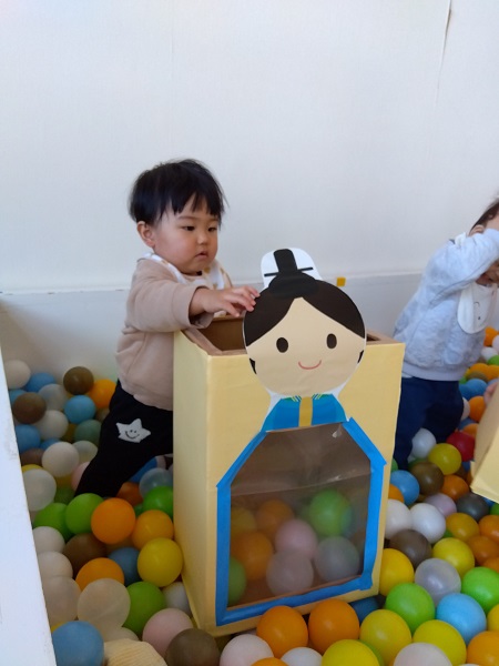 3月3日に東部保育所でひな祭りの会が開かれました。子どもたちはひな祭りの曲に合わせて踊った後、3歳以上のひまわり組ではおひな様オセロ対決やおひな様運び競争、3歳未満児のつくし組はおひな様とお内裏様の箱にカラーボールや花を入れる遊びで楽しみました。 給食はひな祭り特別メニューが提供され、子どもたちは大喜びで完食していました。