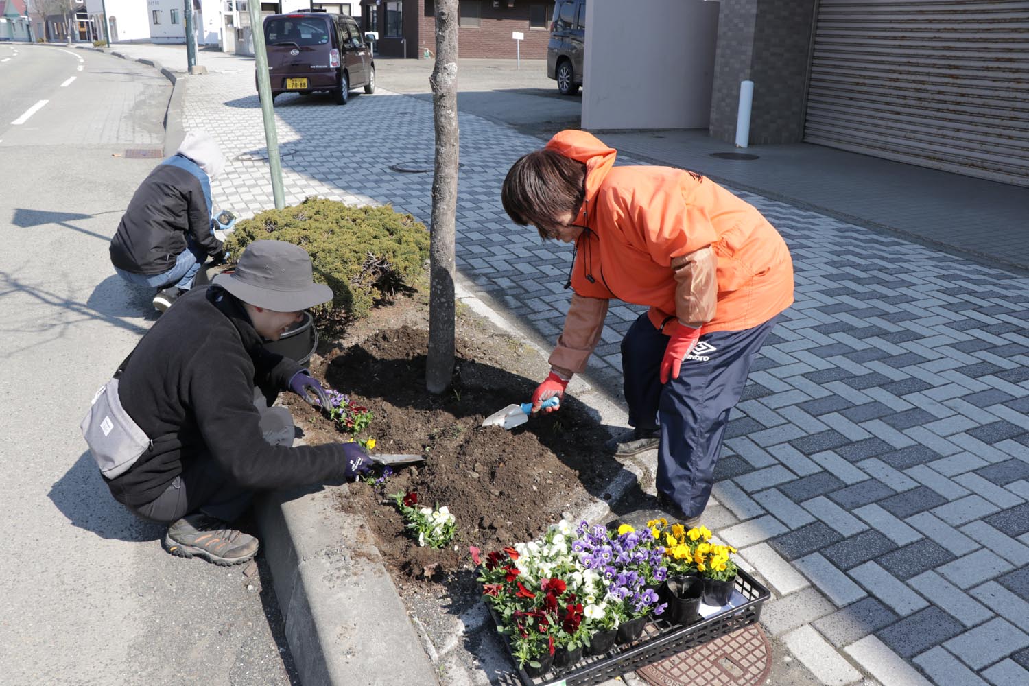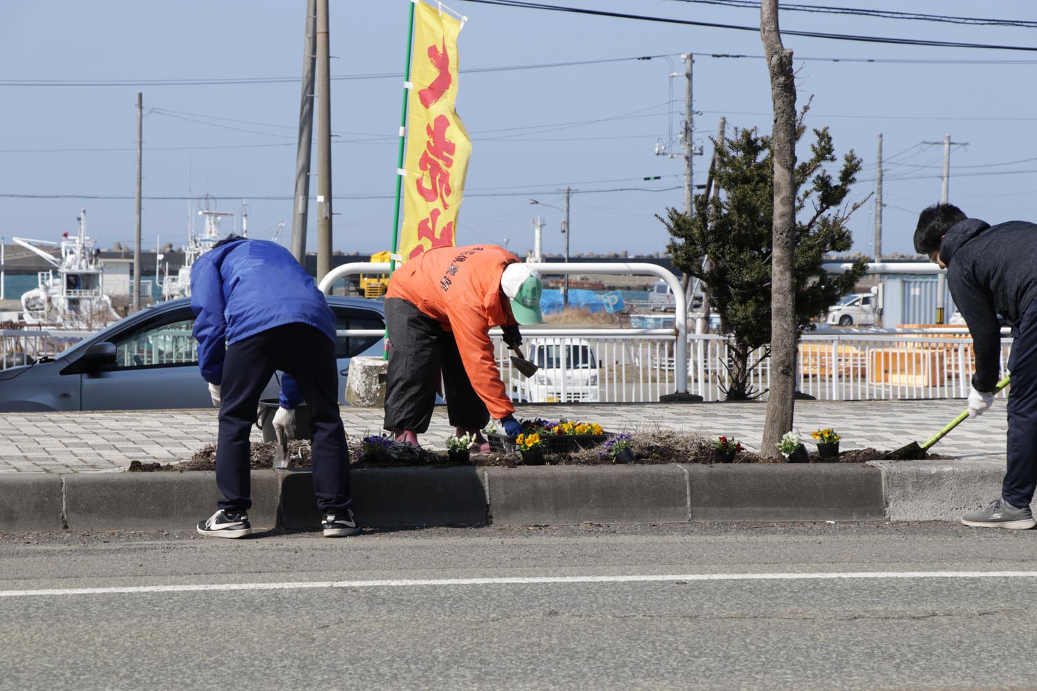 4月5日、町内の花の愛好家らで作る団体、華・花倶楽部(小林美代子会長)が「潮騒ロード」と称し、大通地区の植栽升の草刈りや花植えを行いました。