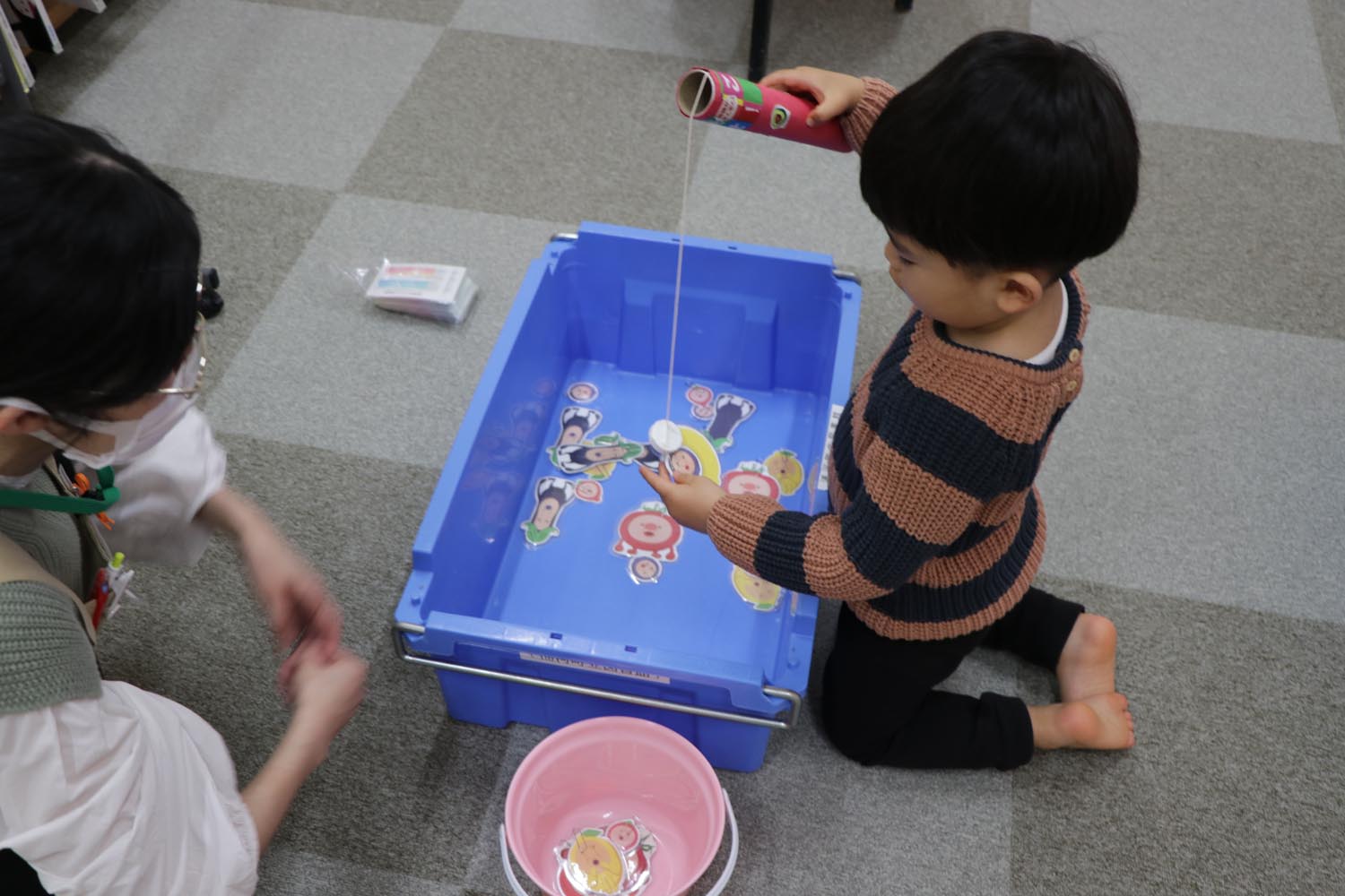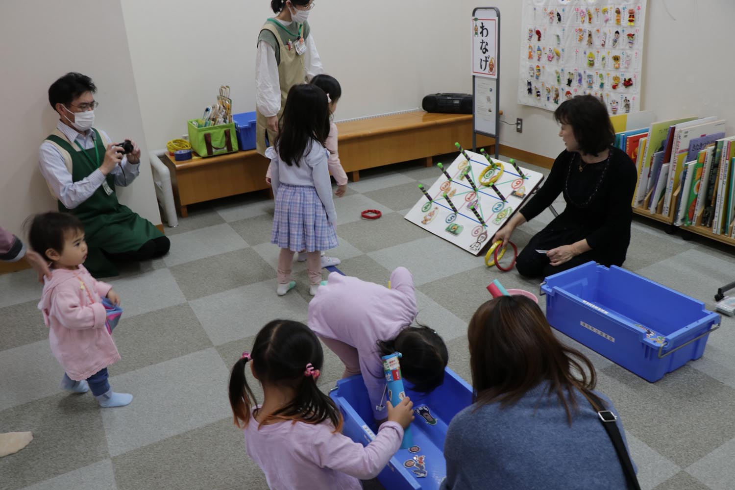 縁日では、輪投げや魚釣り、トントン相撲など昔ながらの遊び体験や、図書館に隠されている「こびと」20体を探すイベントが開催され、会場は楽しそうな雰囲気に包まれていました。