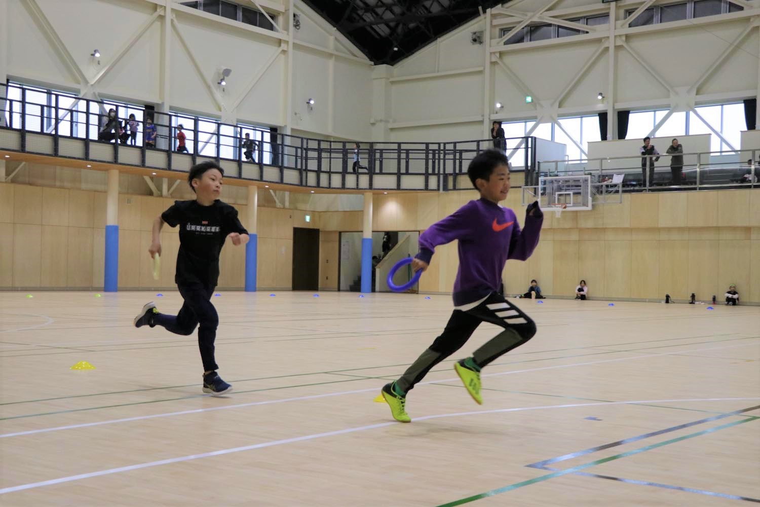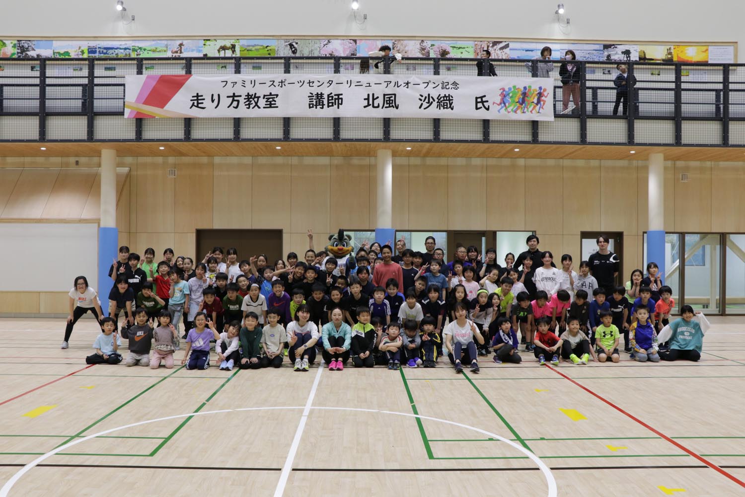 教室は、元陸上競技選手で北翔大学陸上競技部監督の北風沙織さんを講師に開かれ、サポートスタッフとして同大学の生徒2人と、五輪スピードスケート競技で活躍したウイリアムソン・師円さんと小田卓朗さん、北海道日本ハムファイターズのマスコットキャラクターB☆Bが子どもたちへ早く走る方法を伝授。ストレッチから足のあげ方といった技術を伝えた後、実践としてリレーも行われました。