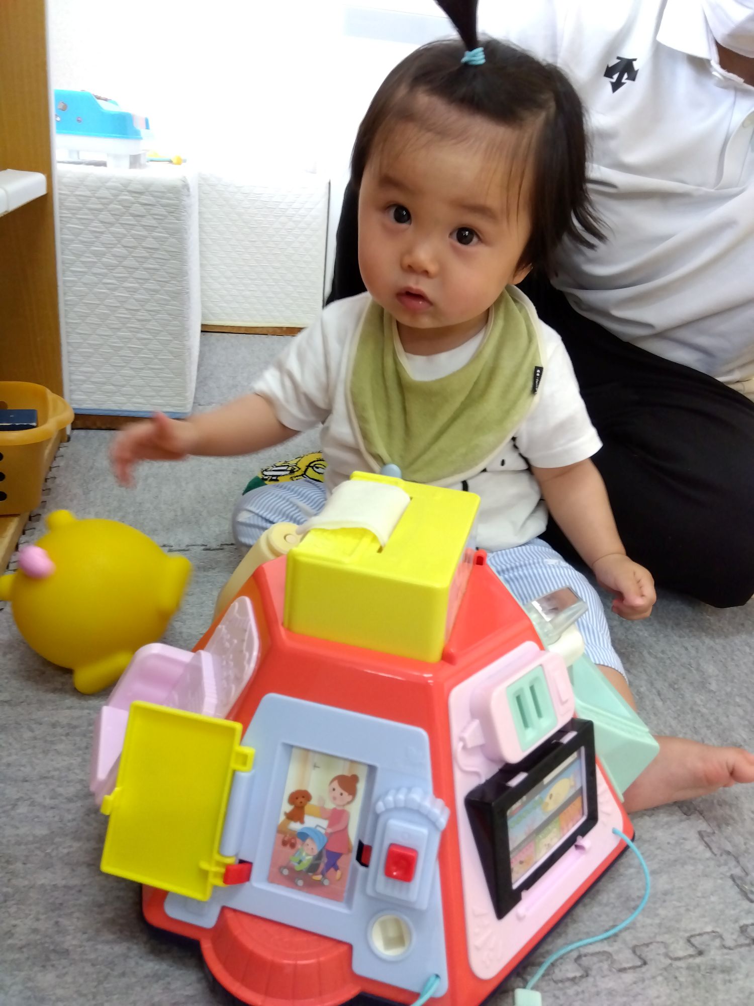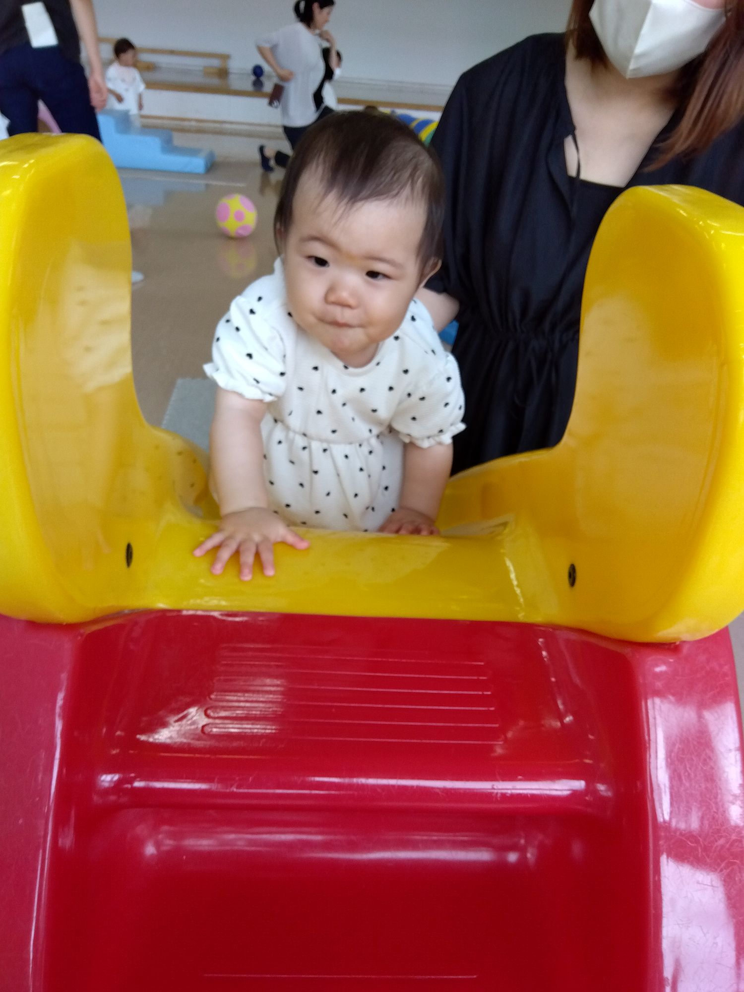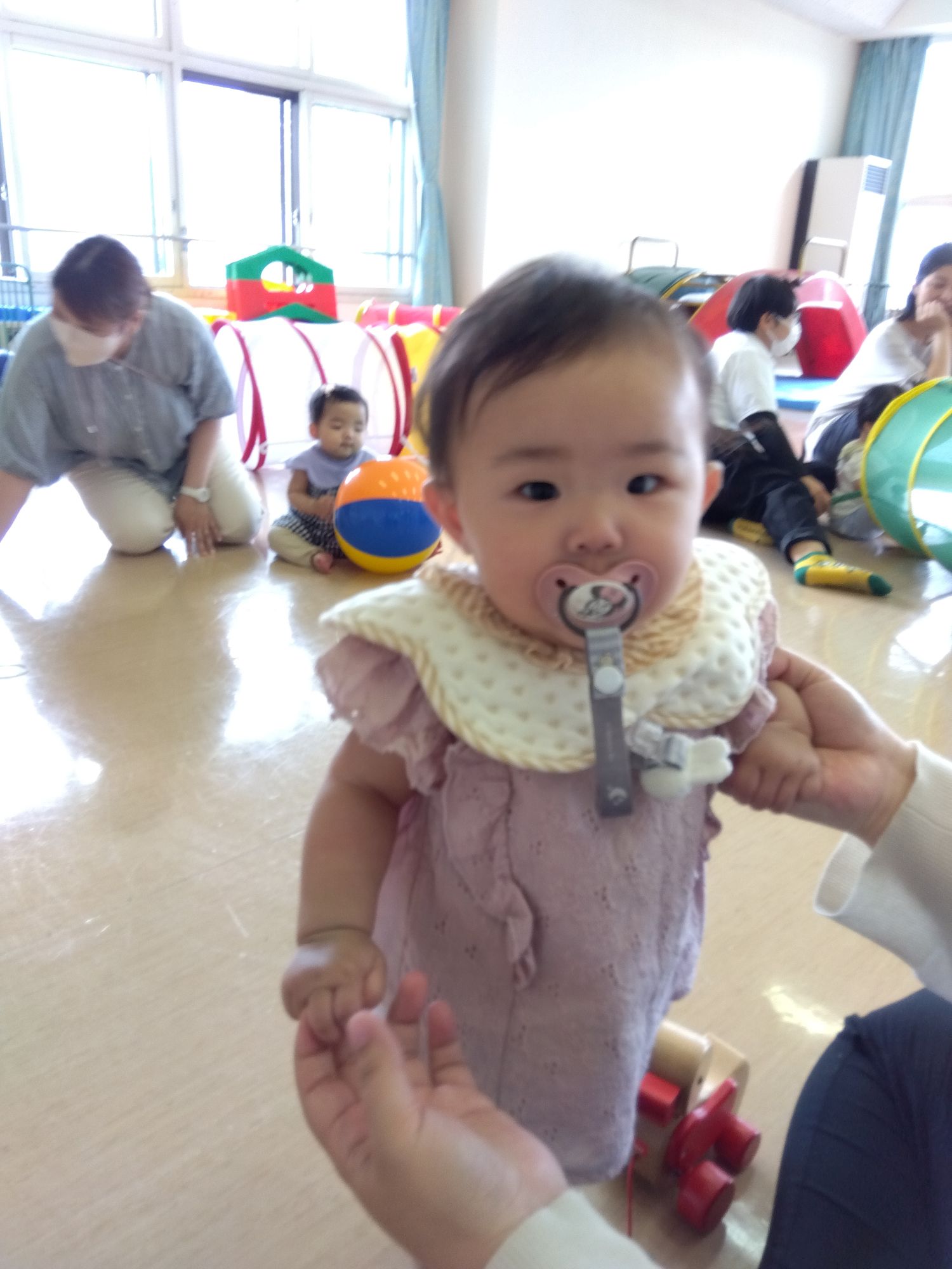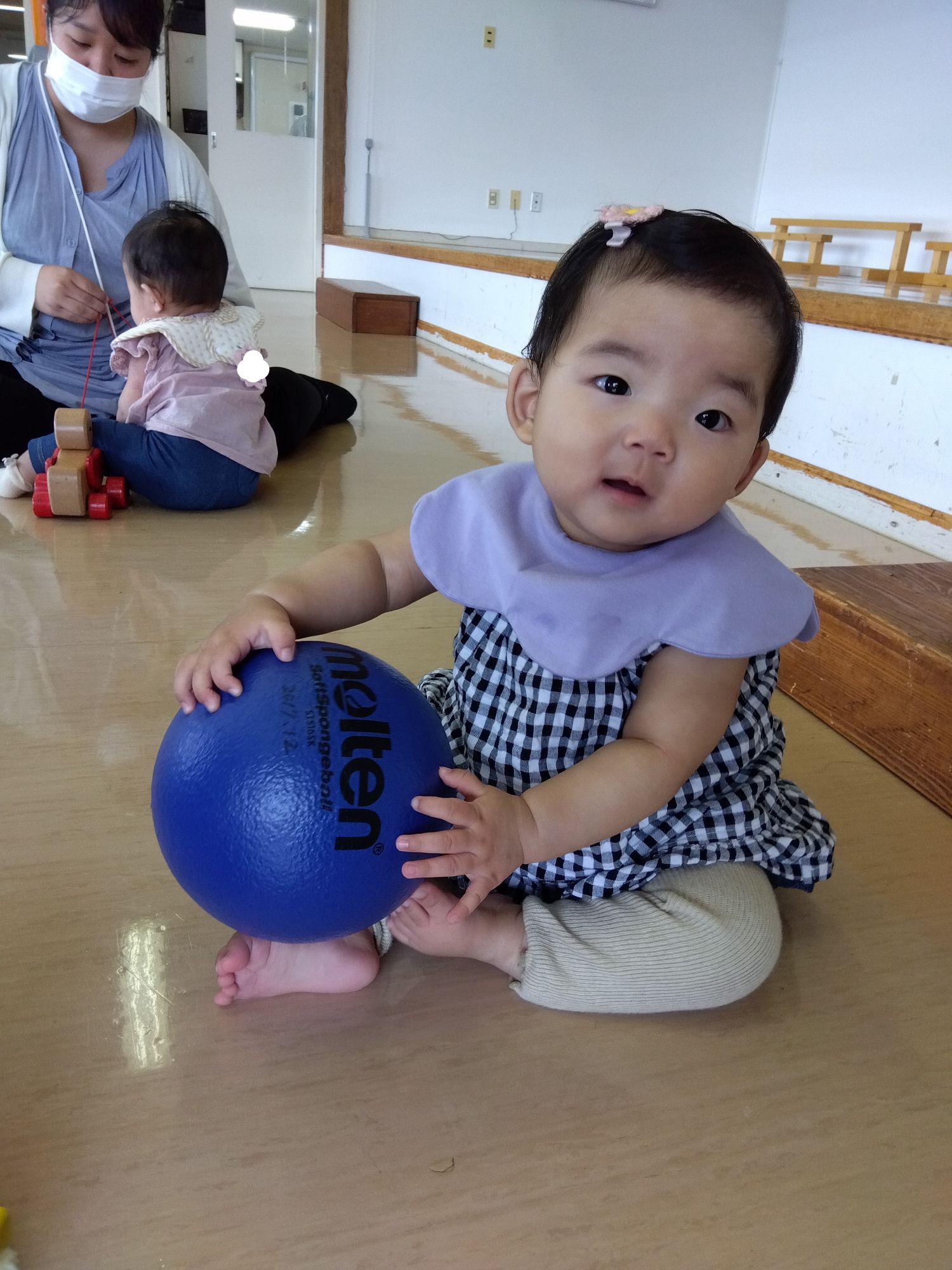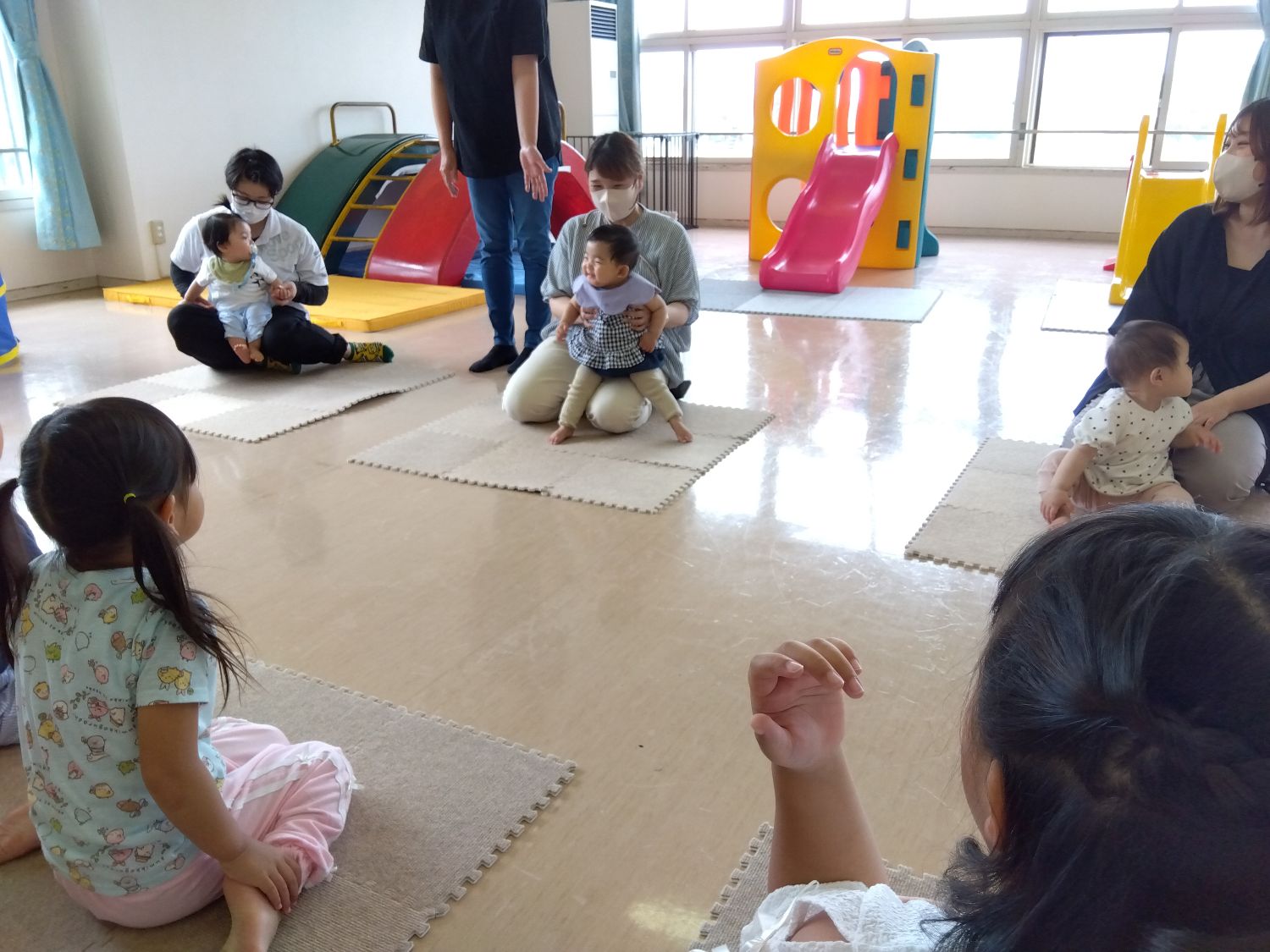 遊びに来た子どもたちは、歌や手遊びで遊び、運動会で在園児が行うパラバルーンの発表を見て笑顔。その後もホールでボール遊びなど、在園児と一緒に楽しく遊びました。