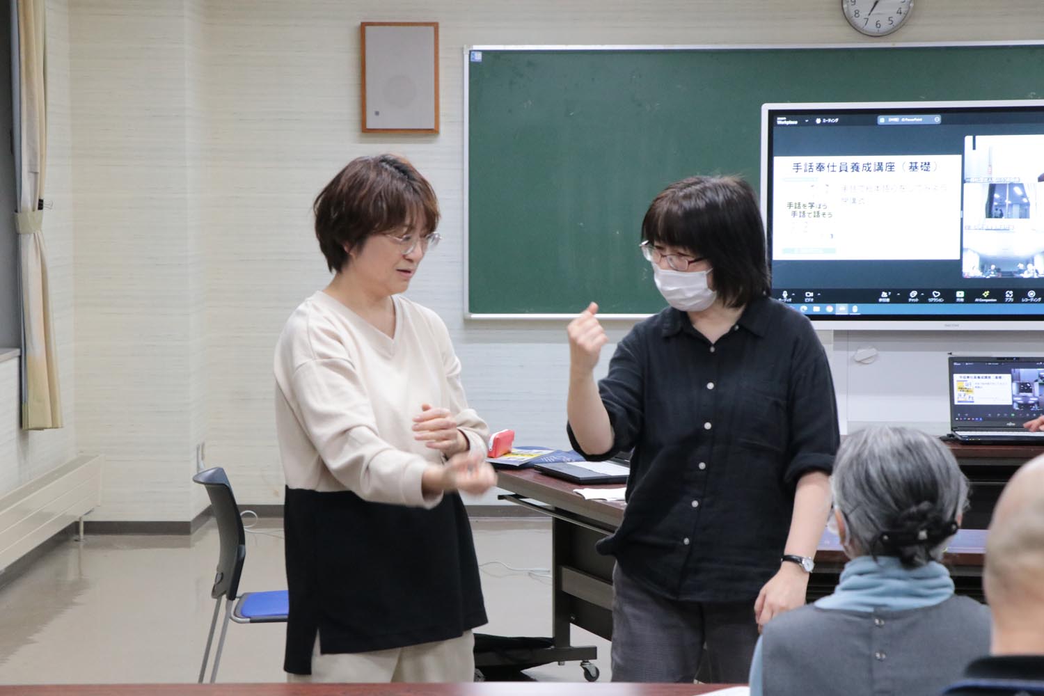 講座には10人が参加し、絵本の物語を手話で表現。講師からは「手話は場面や話の前後で表現方法が変わる。コツは自分のなかで3Dのイメージを作ることを意識して」と話し表現に苦戦する参加者へアドバイスをしていました。