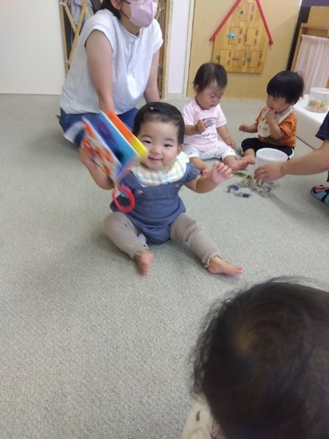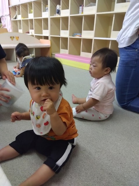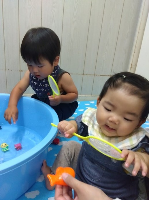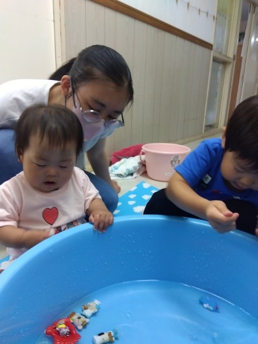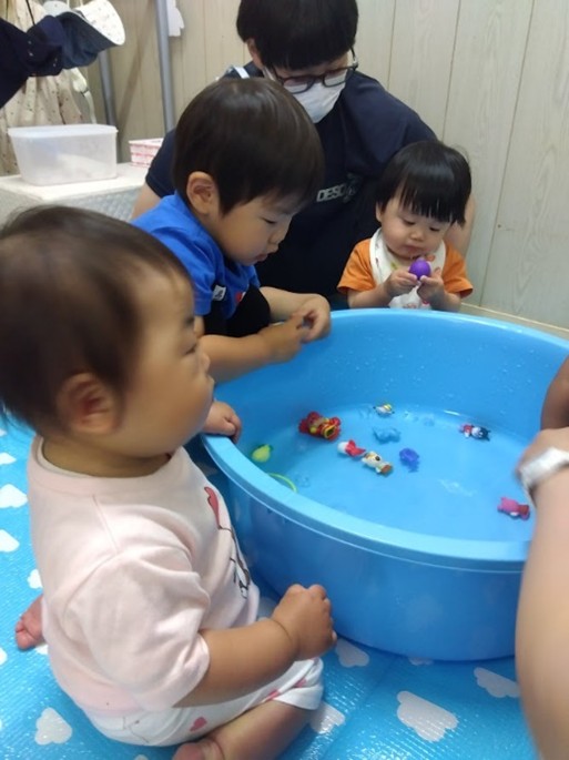 当日はあいにくの雨上がりで外遊びはできませんでしたが、蒸し暑さを吹き飛ばすため、保育所の廊下にタライなどを使った水遊びコーナーを設置。
