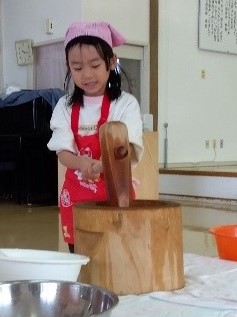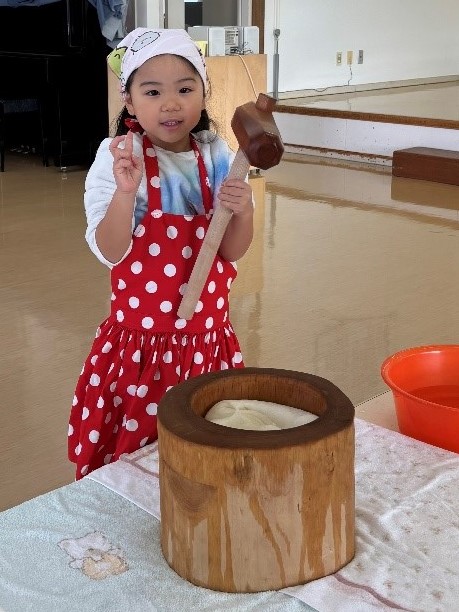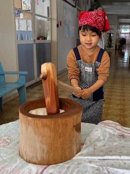 ひまわり組(3~5歳)の園児は、自分で杵をもち「ぺったん、ぺったん」と音を響かせながら夢中な様子で餅をつき、つくし組の園児(0~1歳)は保育士に手伝ってもらいながら一緒に餅つきを楽しみました。