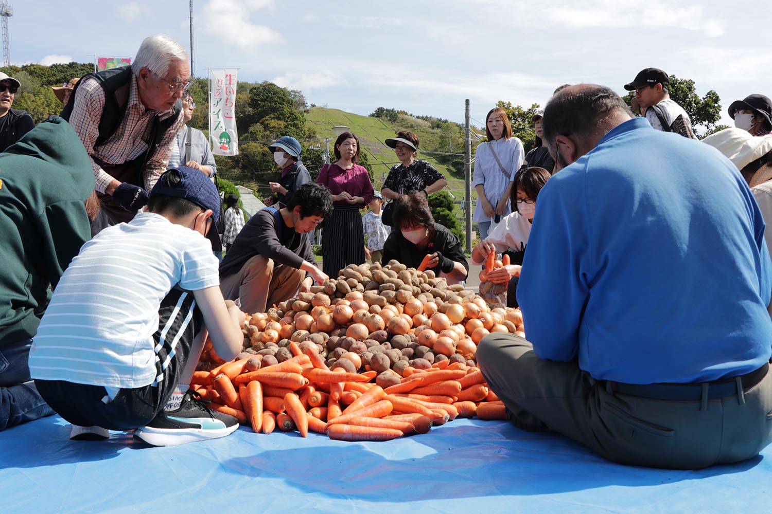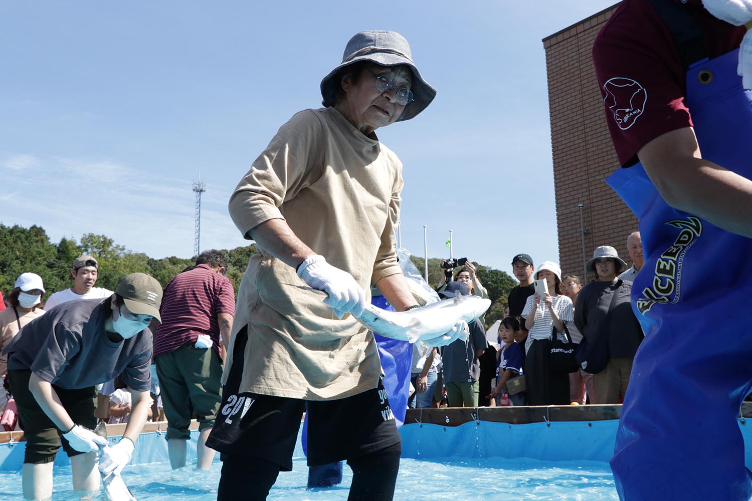 会場では、玉ねぎ、にんじん、じゃがいもの詰め放題や秋サケのつかみ取りが開催。秋サケのつかみ取りでは、参加者らは逃げるサケを捕まえ、にっこりと笑顔を見せていました。