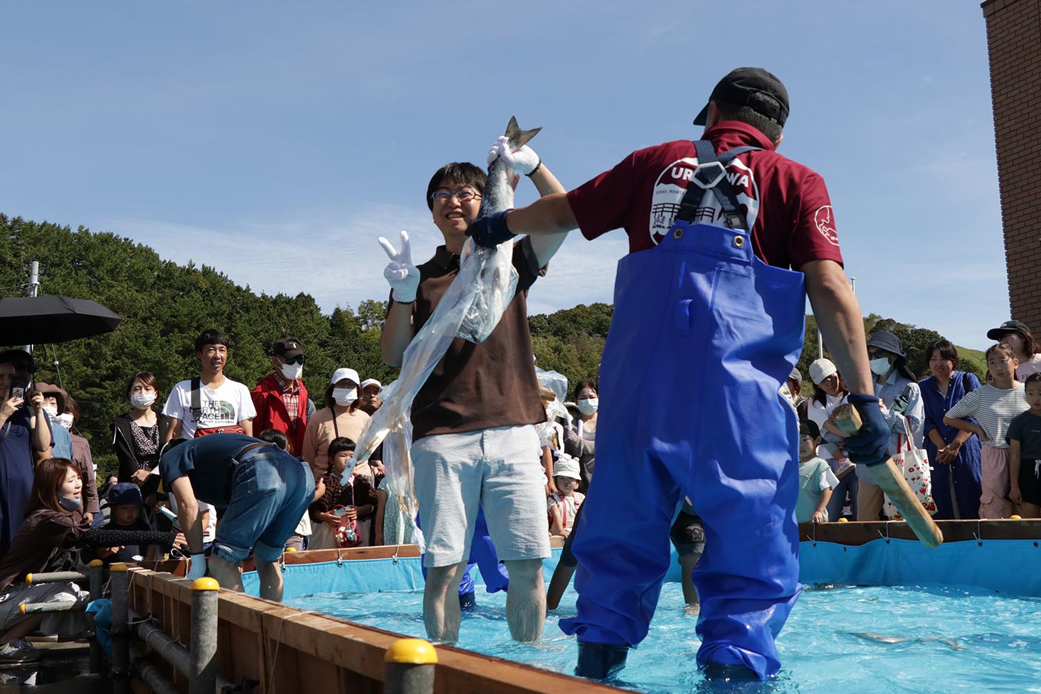 つかみ取りに友達と参加した濱谷優真さん(浦一中1年生)は「サケを捕まえるのは思ったよりも簡単だった。捕まえたサケは塩焼きにして食べたい」と話していました。