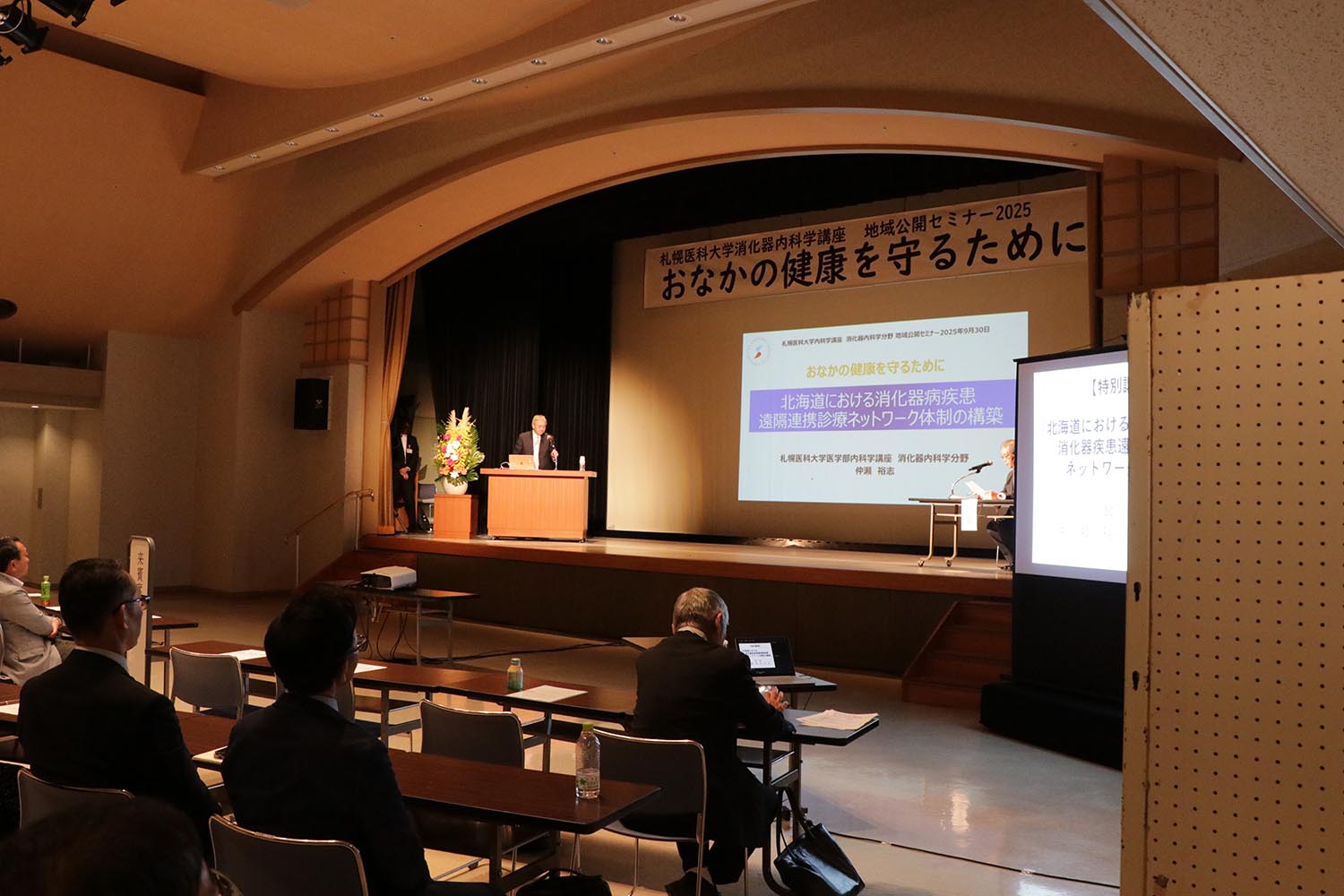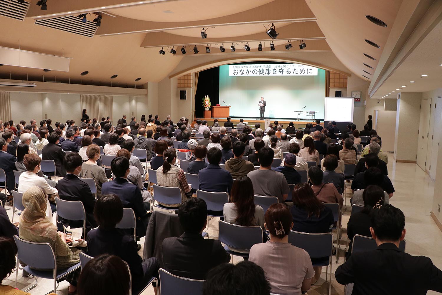 9月30日、浦河赤十字病院が主催する「札幌医科大学消化器内科学講座 地域公開セミナー2025 おなかの健康を守るために」が総合文化会館で開かれ、町内外から約270人が参加しました。