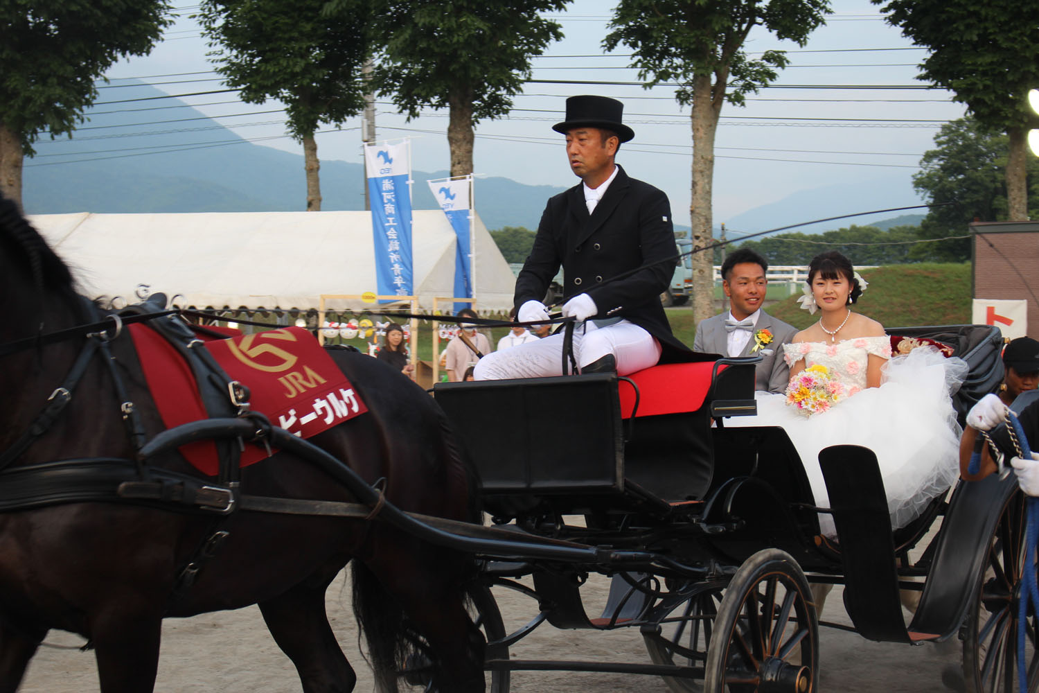 1日目は、来年1月に京都競馬場で行われる「シンザン記念(GⅢ)」でプレゼンターを務めるミスシンザン2人の紹介から始まり、GⅠ優勝馬生産牧場(三嶋牧場・谷川牧場)の表彰、新郎新婦が馬車に乗って登場し集まった人たちから祝福を受ける「馬上結婚式」に競馬グッズのチャリティーオークション、「アキラ100%」さんのお笑いライブが行われました。