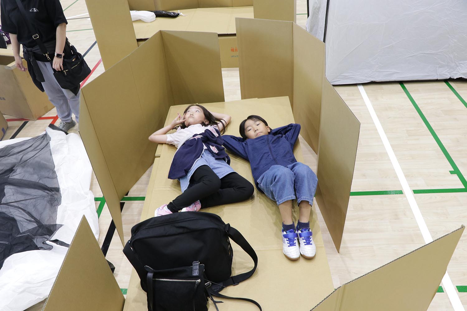 また、ゼロネクストワンアリーナでは、ダンボールベッドや防災用テントの設置訓練のほか、各種防災に関する展示が行われました。