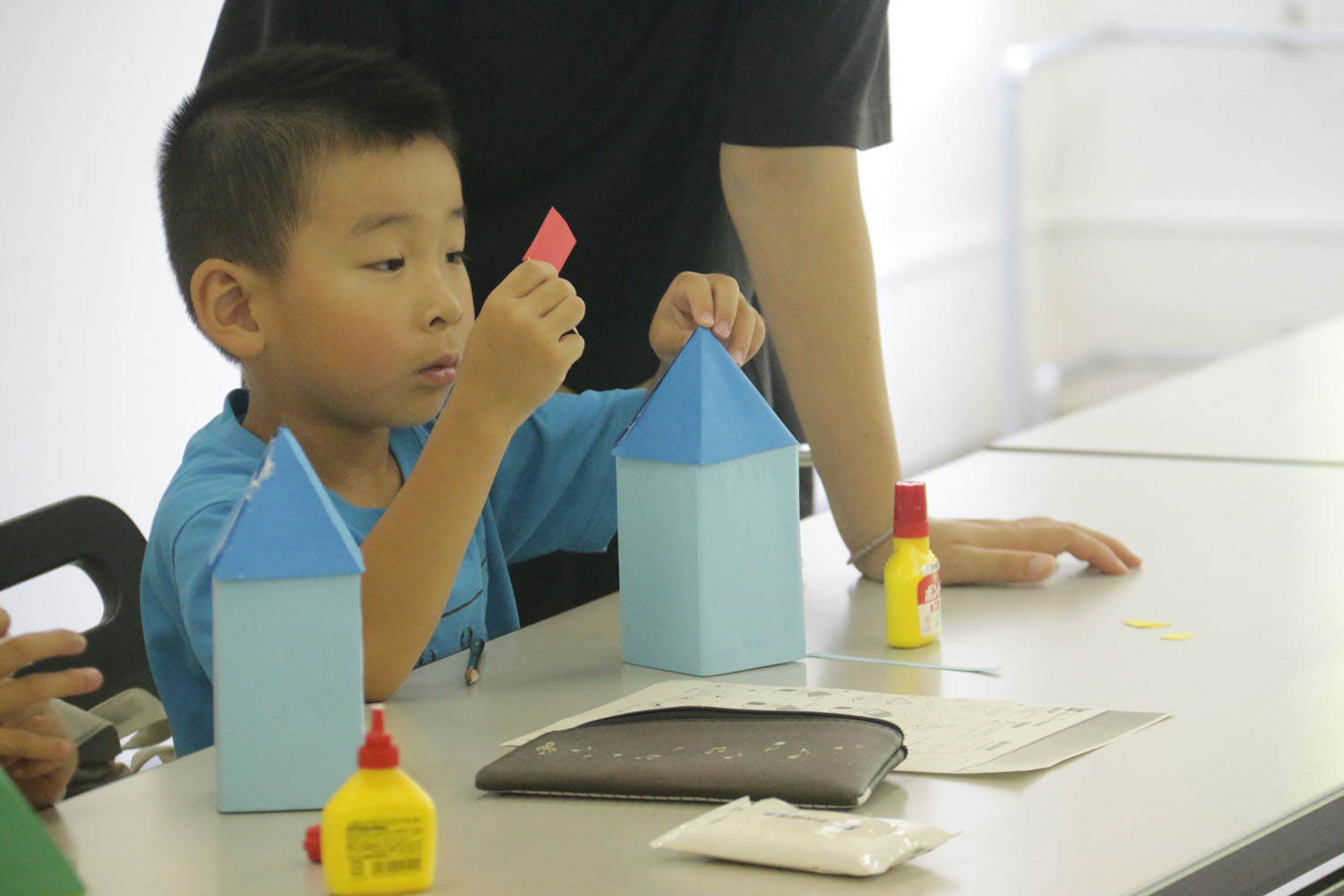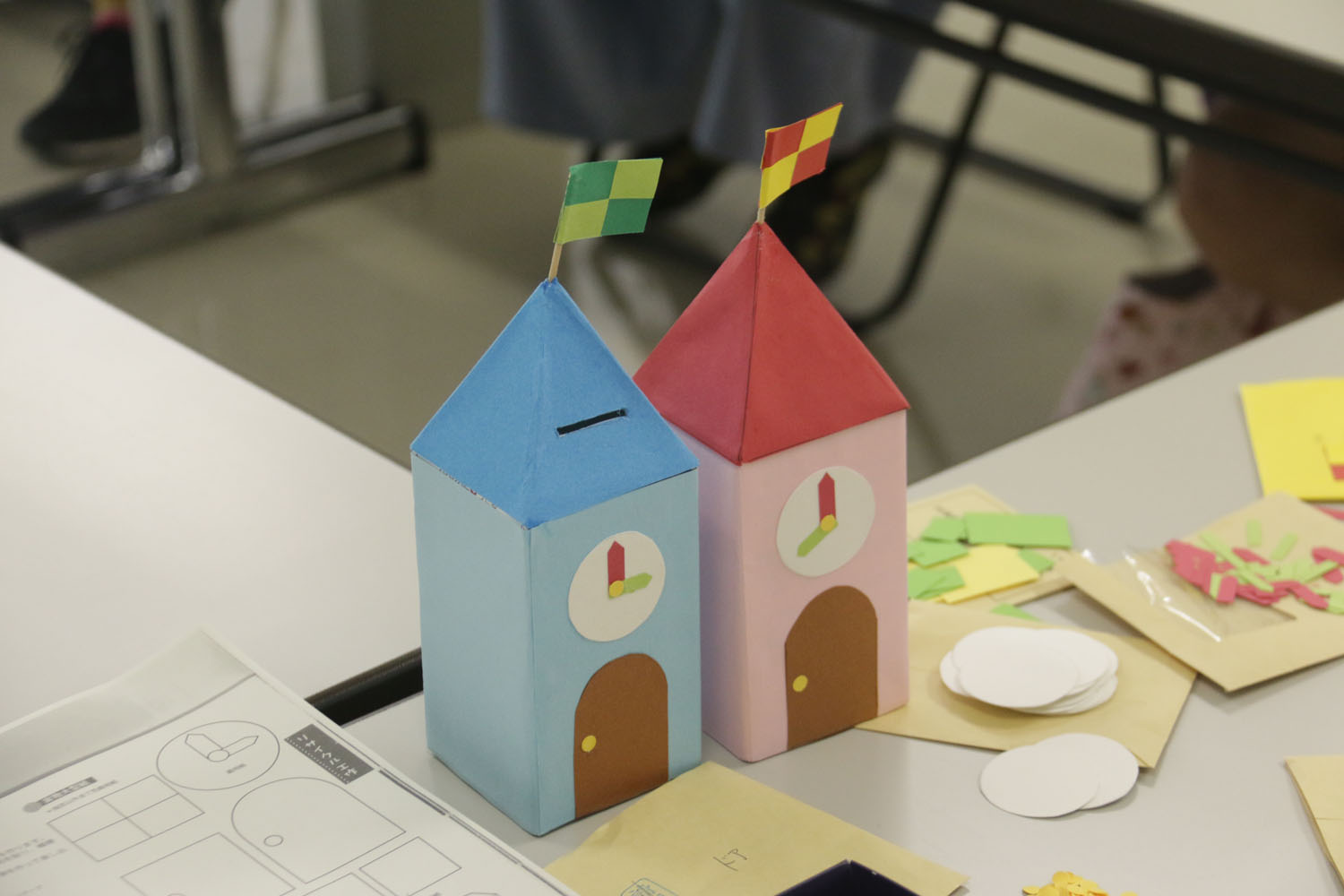 子ども達は、牛乳パックを自分の好きなように色紙やシールでデコレーションし楽しそうに貯金箱を作っていました。