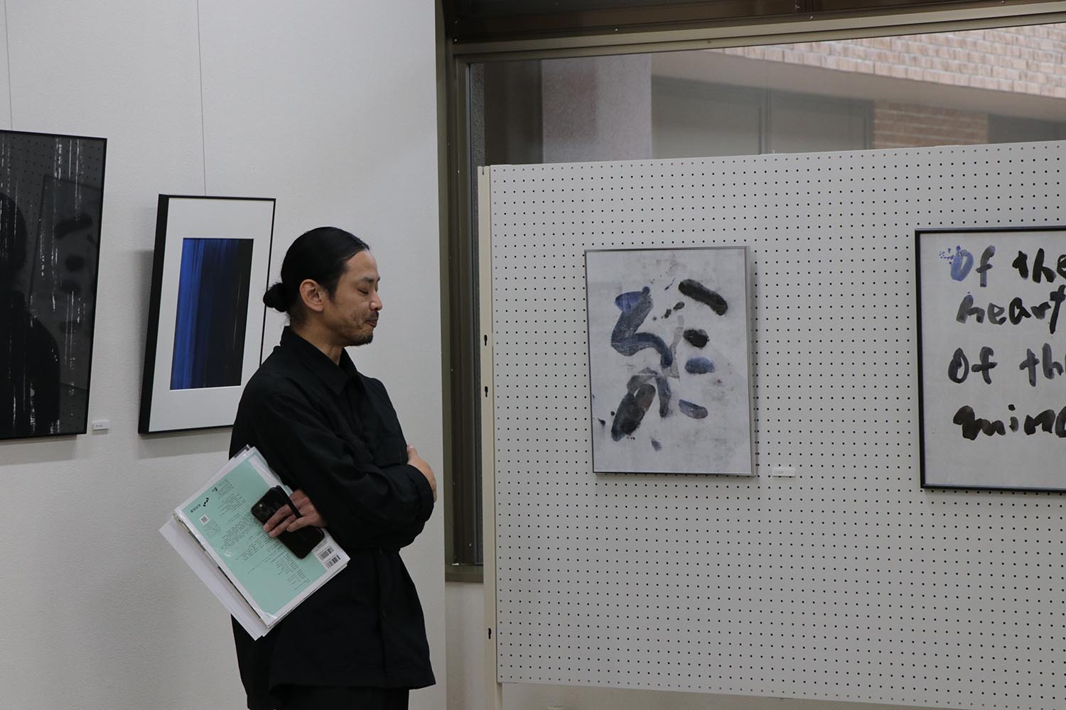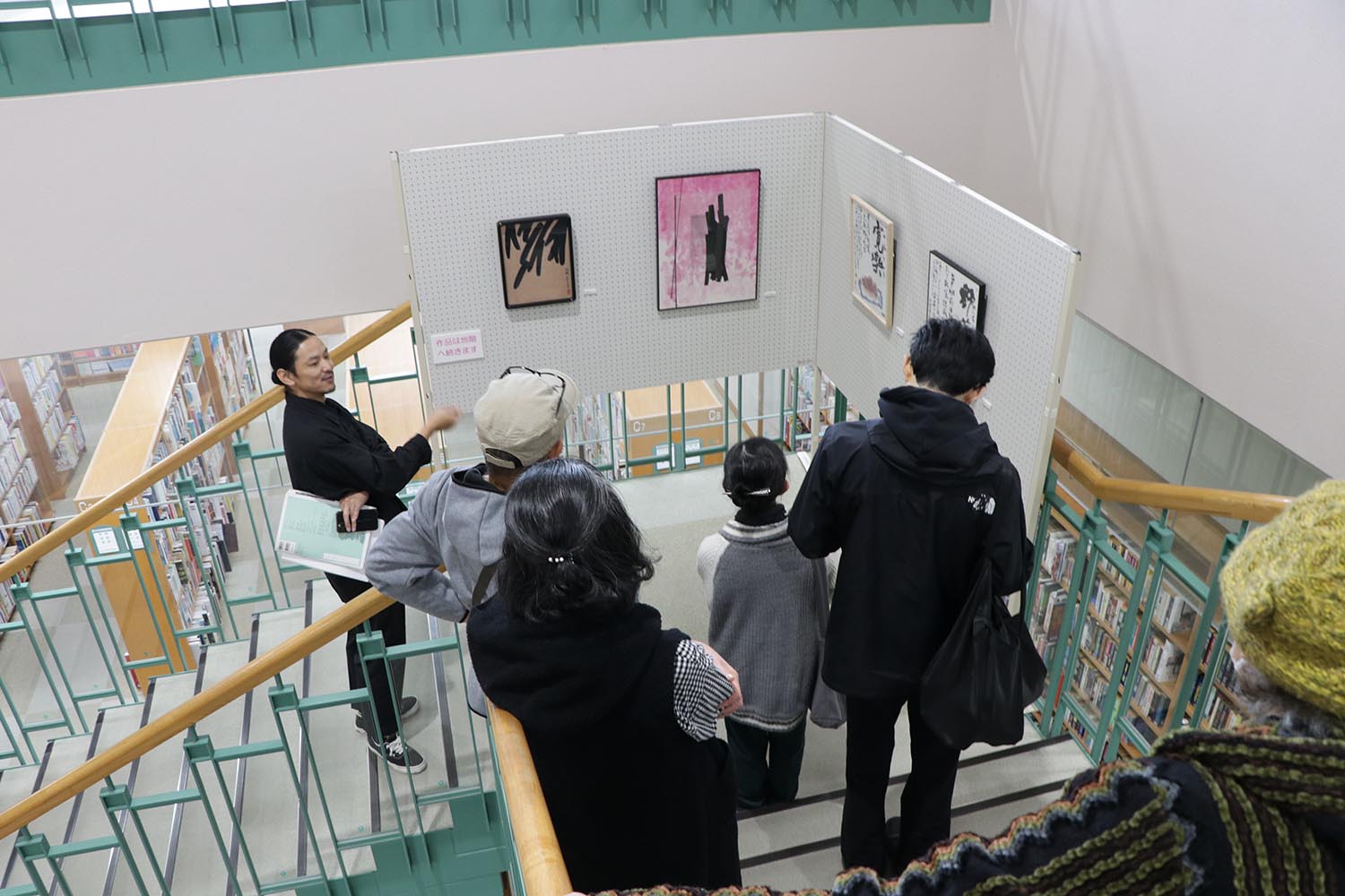 10月26日、浦河町出身の書家・現代美術作家、最倖庵(さいこうあん)池田守さんによるギャラリートークが町立図書館で開かれ、来場者に自身の作品の意図や技法について語りました。