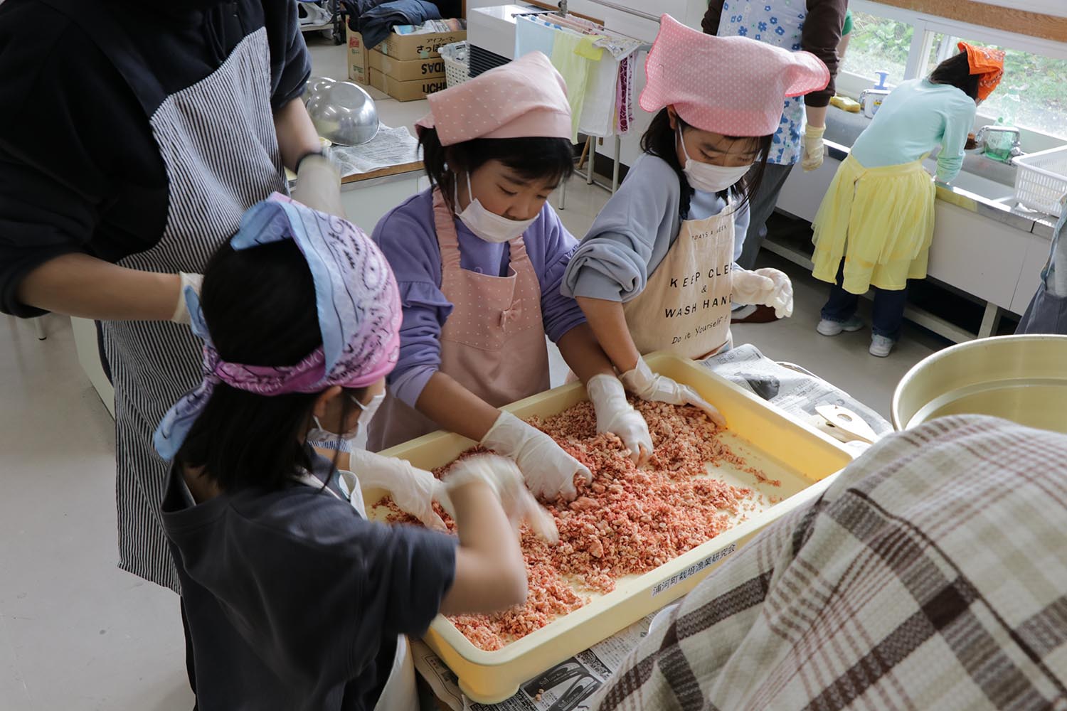 説明が終わるとサケフレークづくりが始まり、子どもたちはサケの身ほぐしから袋詰めを体験。細かい骨や血合いを取り除く作業に黙々と真剣な様子で取り組み、袋詰めが終わると満足げな表情を見せていました。