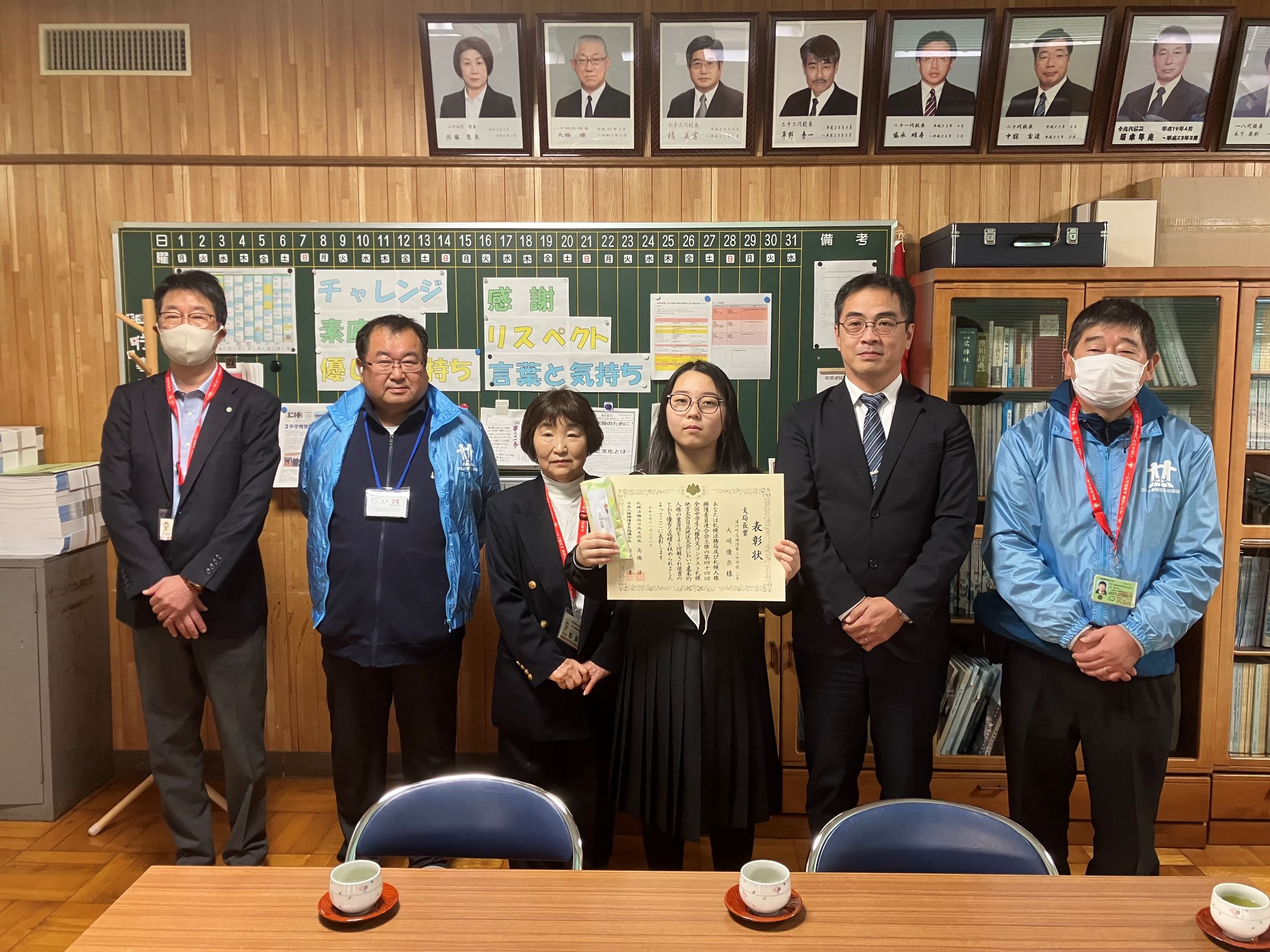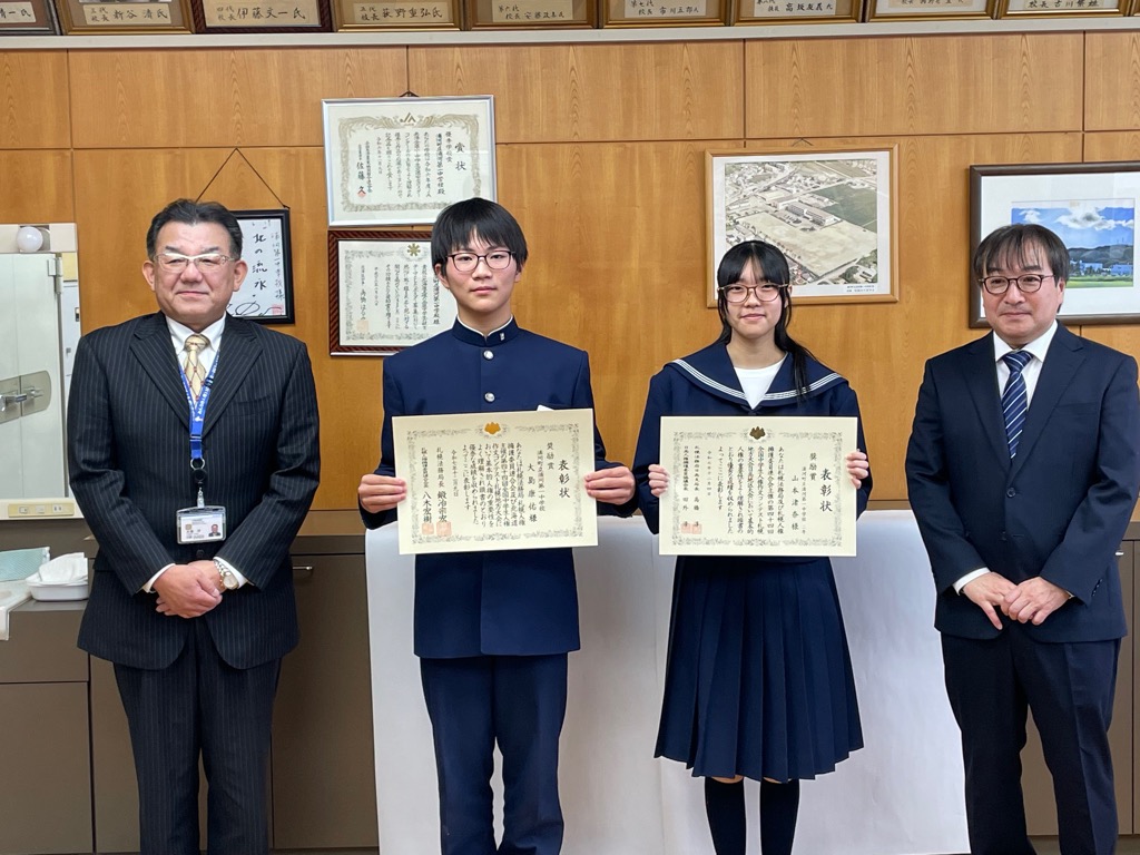 12月4日のこの日は、浦一中で札幌法務局日高支局長より二人に表彰状が手渡され、川野校長は「2人とも素敵な作品を書いてくれた。今の気持ちをもって今後も生活してくれれば」と話しました。