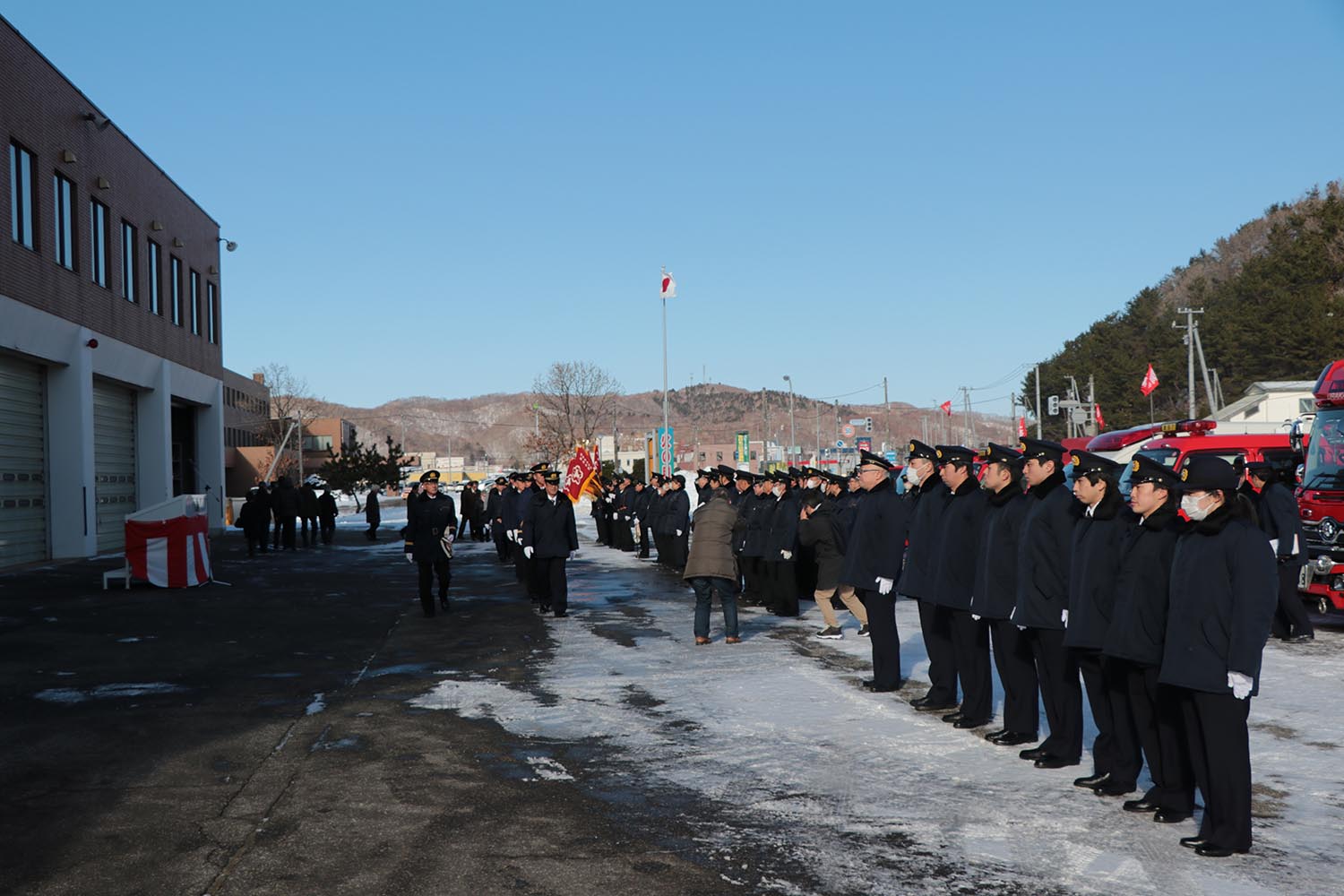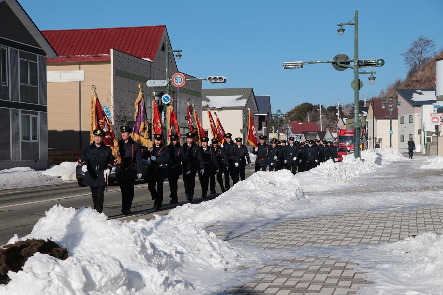 この日は、浦河消防署の管理者である松田町長の観閲の後、消防署から総合文化会館まで行進。その後、同会館にて式典を行いました。