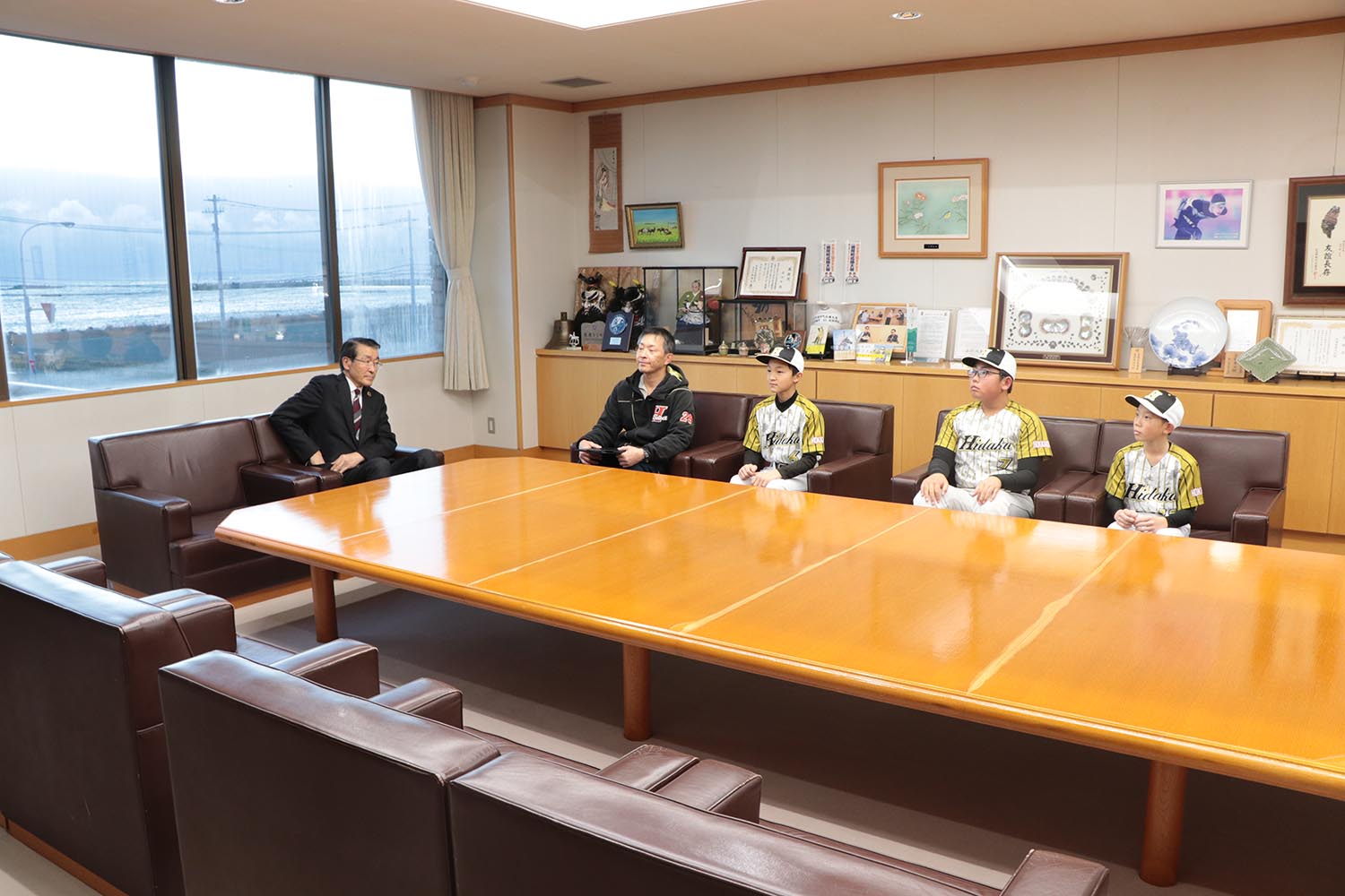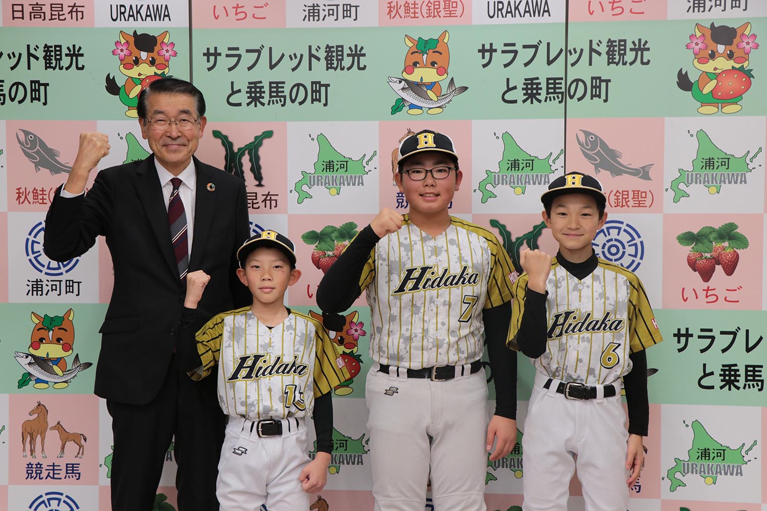 12月12日、日高選抜チームとして選ばれた「うらかわ野球少年団」の松田灯真さん(浦河小6年)、石居秀一さん(堺町小6年)、榊優真さん(堺町小6年)の3人が第22回青山杯西日本友好学童軟式野球大会に出場することを受け、池田前町長に表敬訪問を行いました。