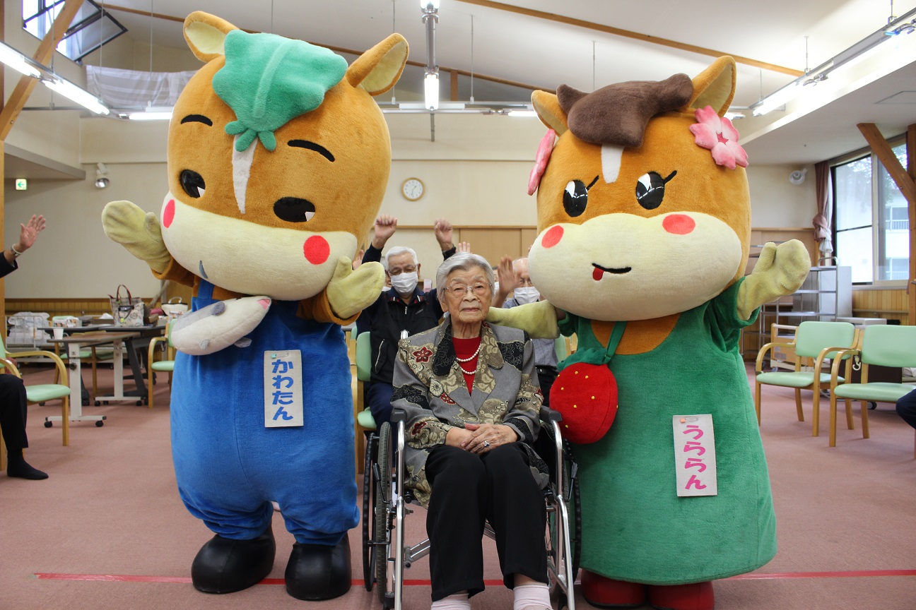 細道さんには、内閣総理大臣からの賞状と銀杯が贈られた後、浦河町からカタログギフト、ご家族からもプレゼントが贈られました。この日は町のイメージキャラクター「うららん・かわたん」もお祝いに駆けつけました。