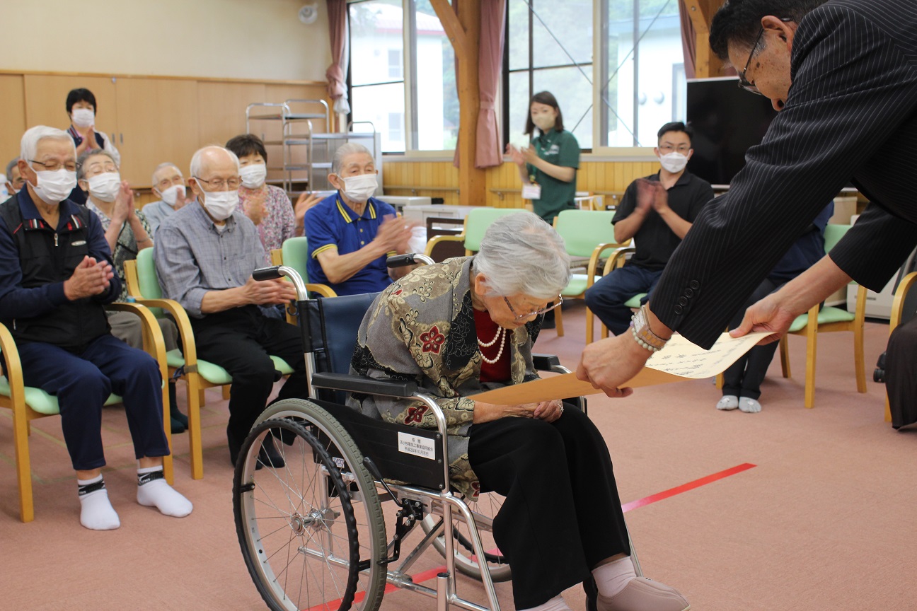 細道さんは「こんなに長生きさせていただきまして、今日は皆さんにお祝いしていただき本当にありがとうございました。関東大震災の月に生まれ、それから100年になります。センターの皆さんにも、いつもお世話になって本当に感謝しています。いただいた命を大切に、一日一日、気を付けて生きていきたい」と感謝を述べていました。
