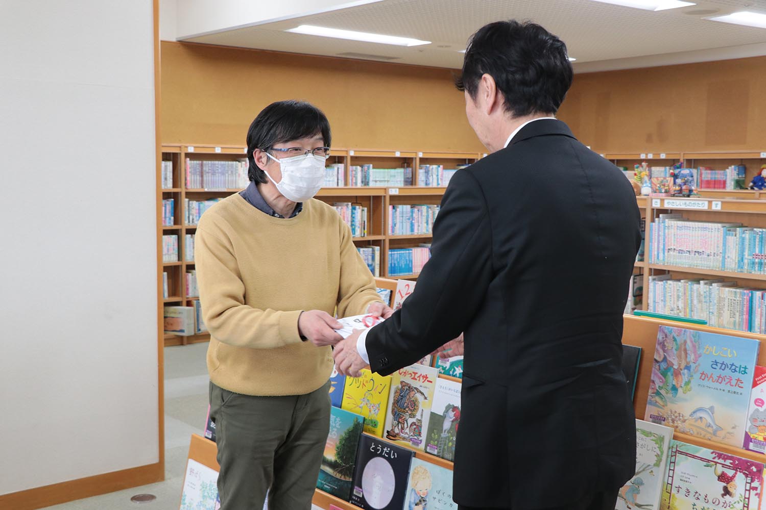 目録を受け取り和田教育長は「読み聞かせ用の本なども充実してきており、今回の寄贈に心から感謝している。今後も町民に愛される図書館づくりに努めていきたい」とお礼の言葉を述べました。