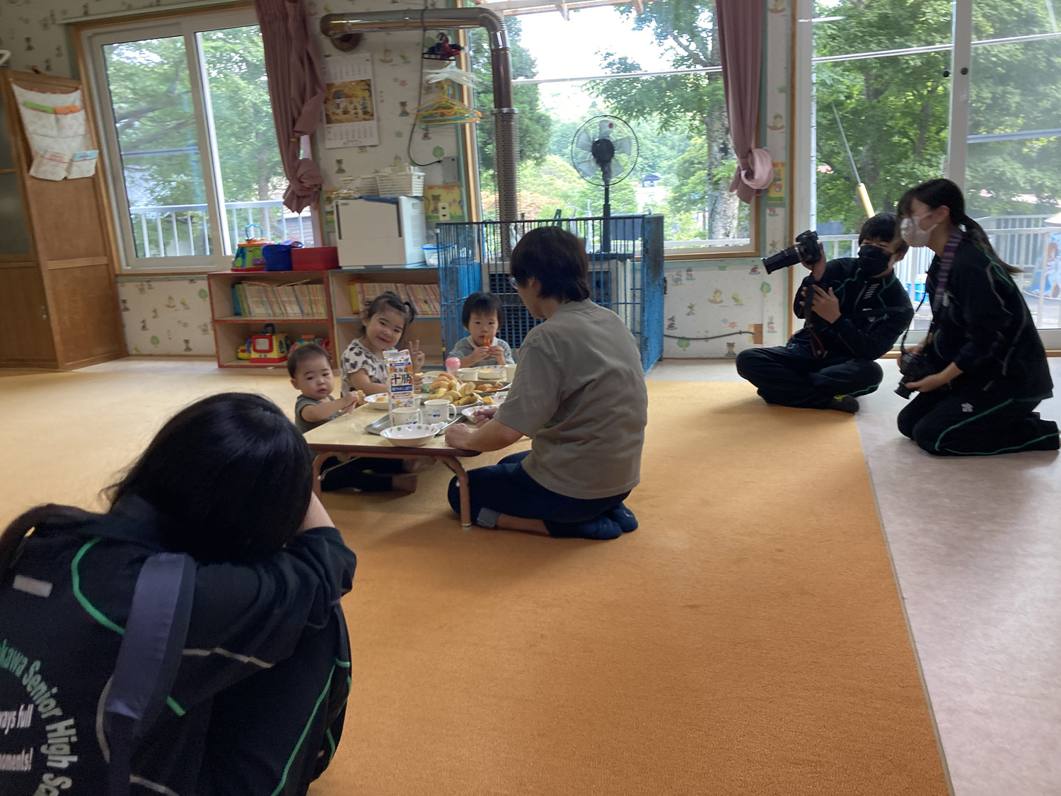 こんにちは、子育て医療課です。 浦河高校写真部の生徒による保育の魅力を発信する企画を進めています。 9月16日は町内の私立保育所を訪問、元気いっぱい遊んだりおいしい給食をほおばる様子をカメラに収めました。 来年の2月ころには写真展を開催する予定です。どうぞ楽しみにお待ちください。