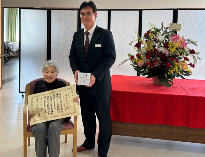 2月24日、浦河緑苑とルピナス舘で100 歳到達に伴う祝品の贈呈式が行われ、馬道トミさんと中垣ハナヱさんへ記念品が贈られました。