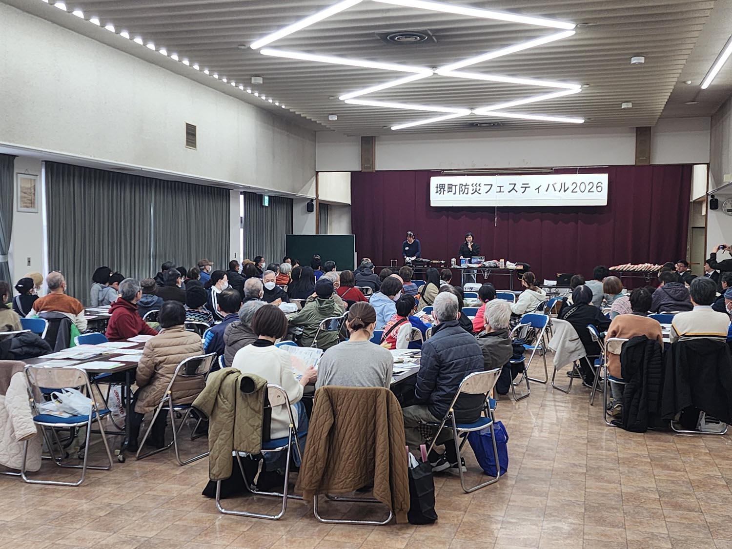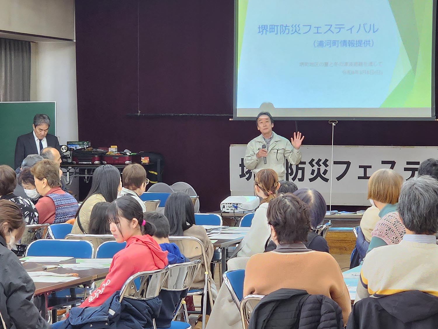 3月8日、基幹集落センター堺町会館で、堺町自治会連合会が主催する「防災フェスティバル」が開かれ自治会員約120人が参加しました。 このイベントは、災害への備えや地震や津波が発生した際の対応について、住民同士で交流しながら学ぶもので、昨年より実施され今回で2回目。話し合いでは、昨年の津波避難からの経験を踏まえ、防寒対策や日頃からの備蓄の重要性、緊急時のトイレ対策などについて意見が交わされました。