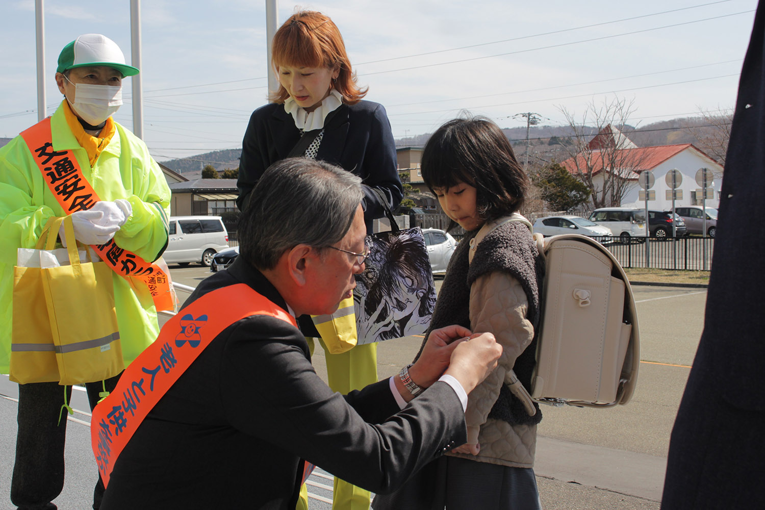 このうち堺町小学校(櫻井亮校長)では、新入学児童の交通事故防止啓発活動が入学式前に行われ、松田町長や加納剛日高振興局長のほか交通安全母の会(中宿邦子会長)が登校する新入学児童に防犯ブザーなどの啓発資材を手渡して、新入学児童へ交通安全や防犯を呼びかけました。